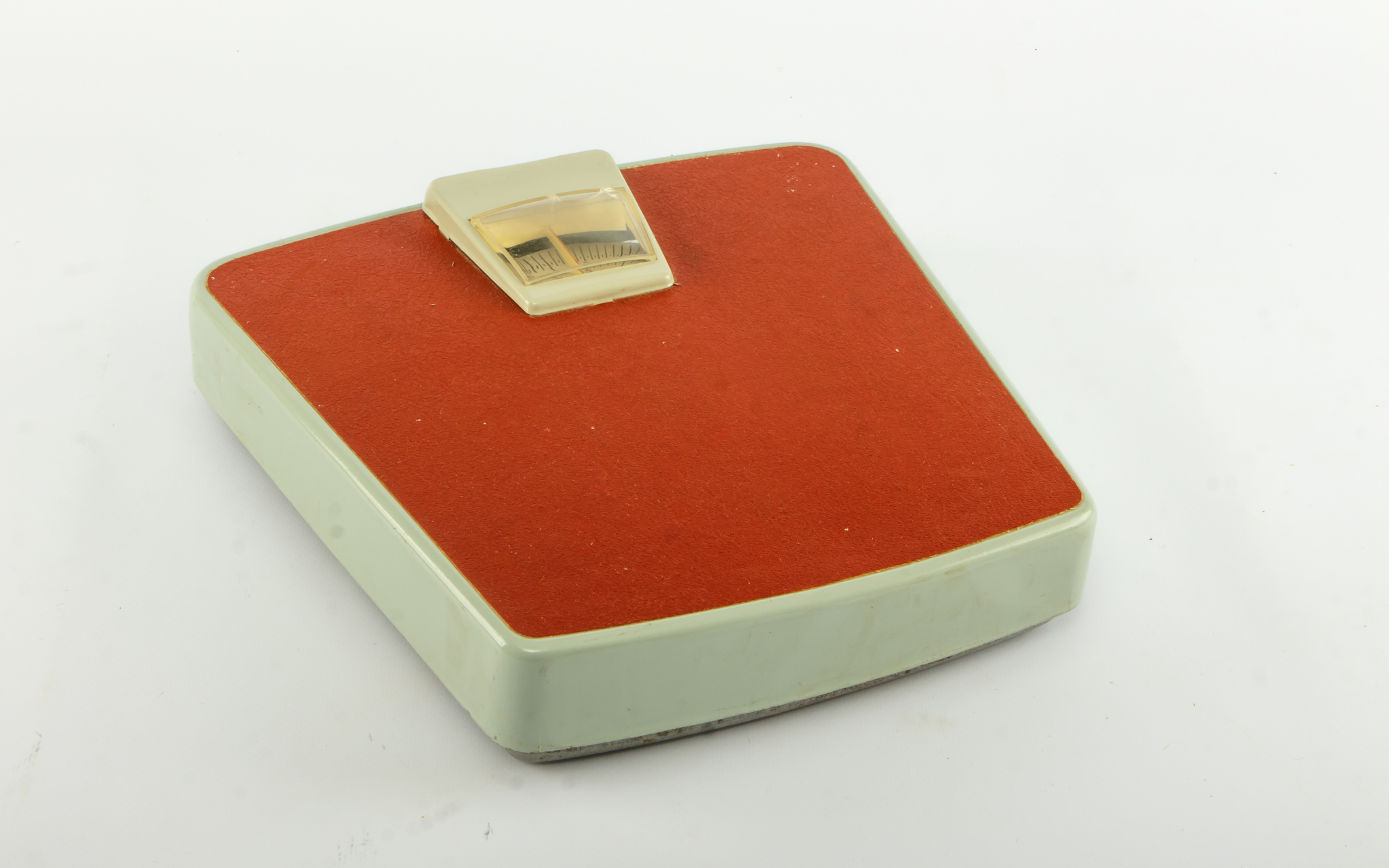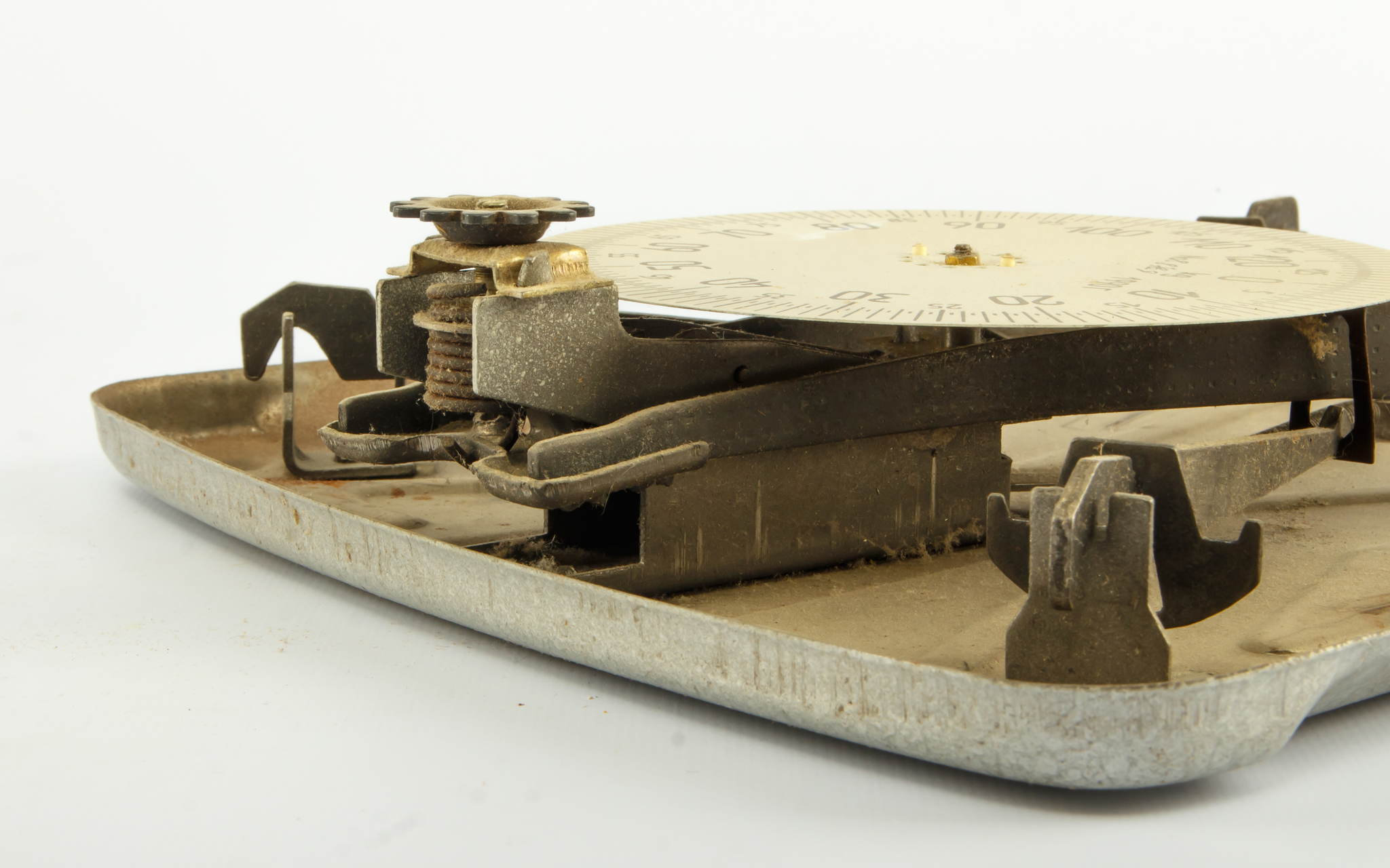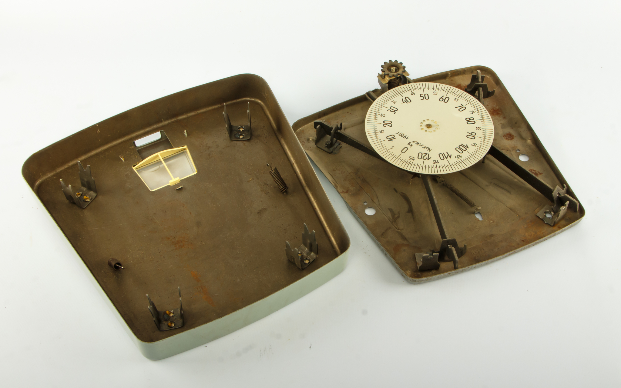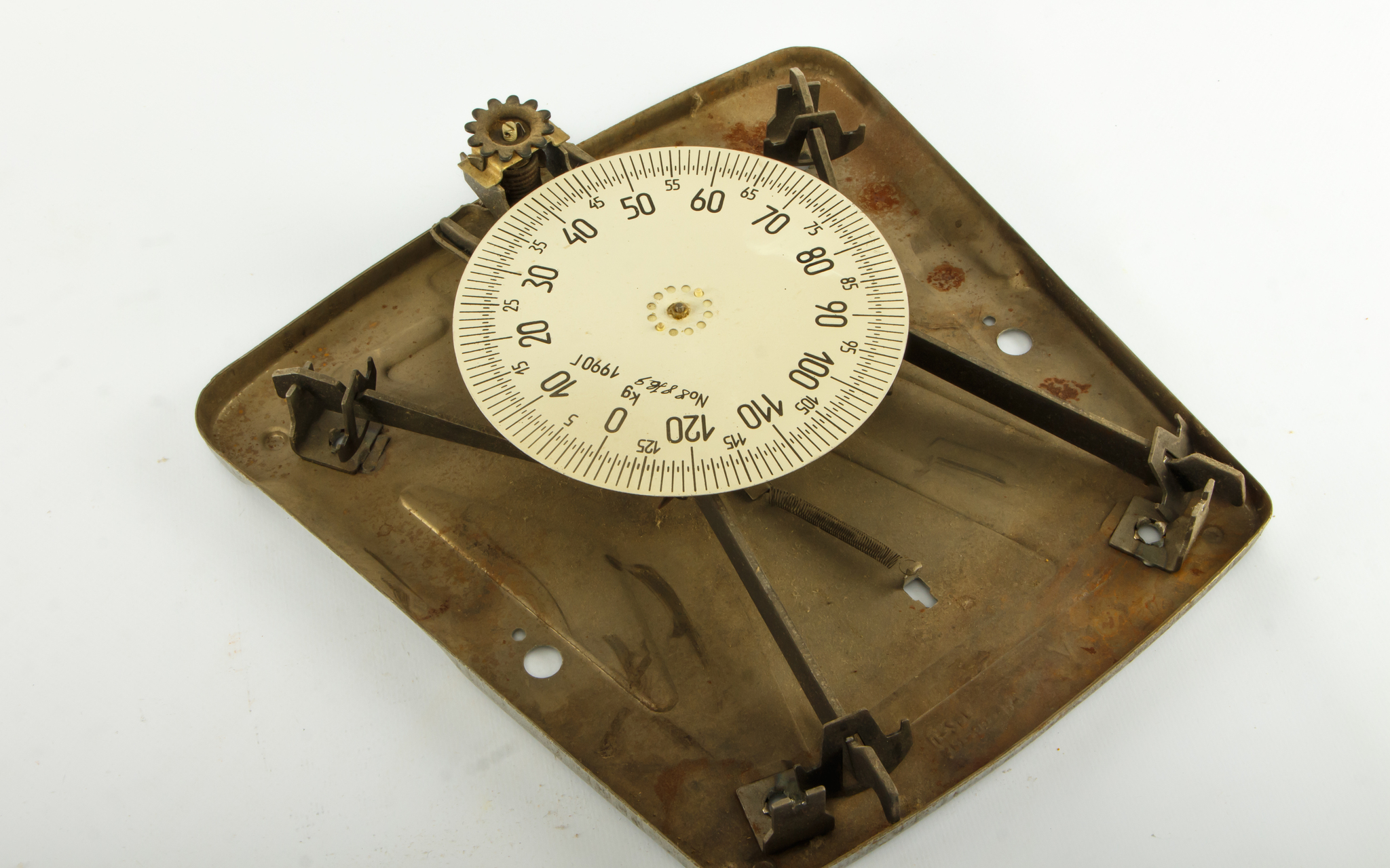 Через систему рычагов, вес человека растягивает пружину, и величина ее растяжения показывает поворотная шкала.