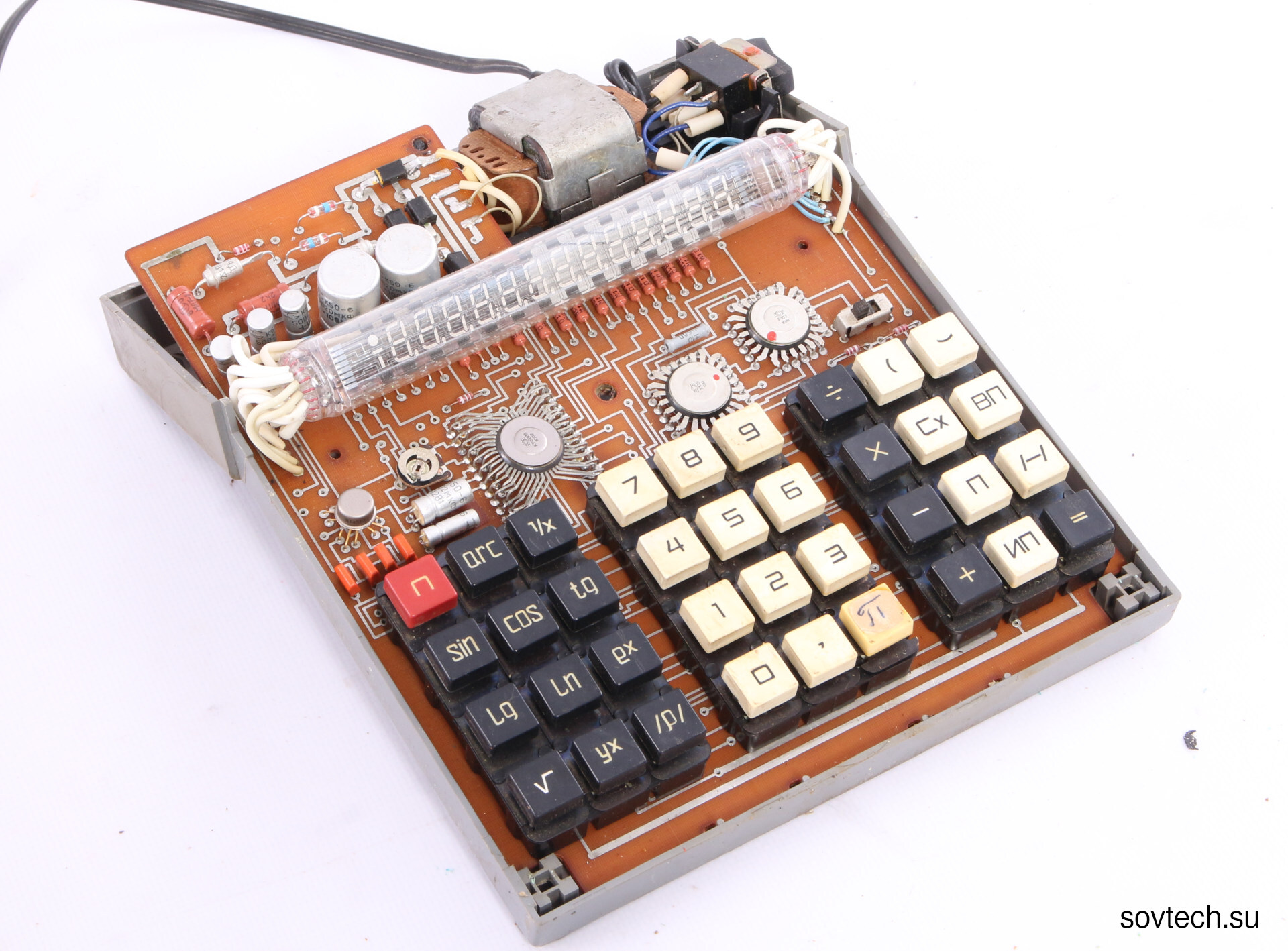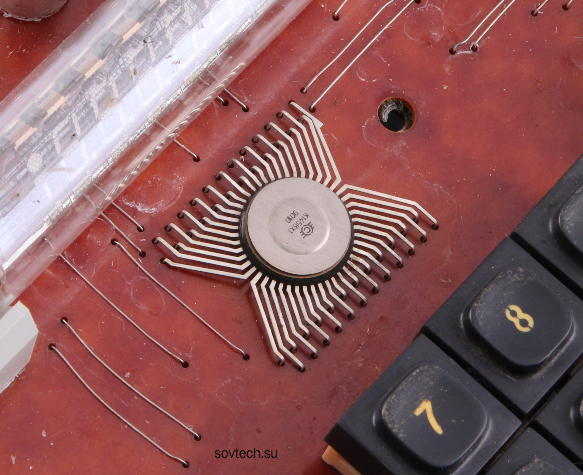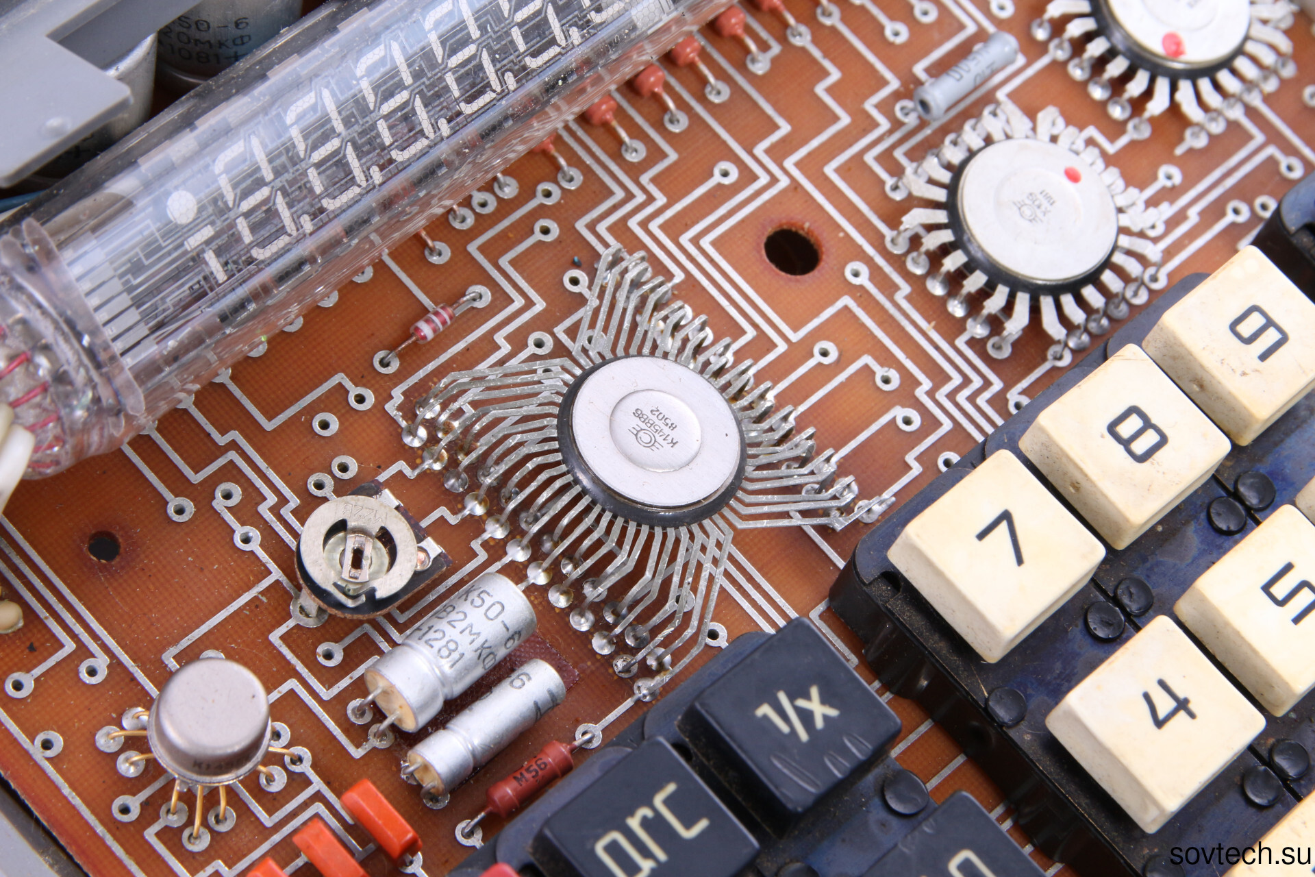 Следующий у нас МК-42. 1990 год, тоже ПО Светлана. Цена 100 руб. Видно, насколько поработали над технологичностью изделия. Печатная плата теперь односторонняя, микросхема одна - К145ВХ1. Выводы ВЛИ уложены в пластиковый сепаратор, а не индивидуально одеты в кембрик. Впрочем и математические функции проще.