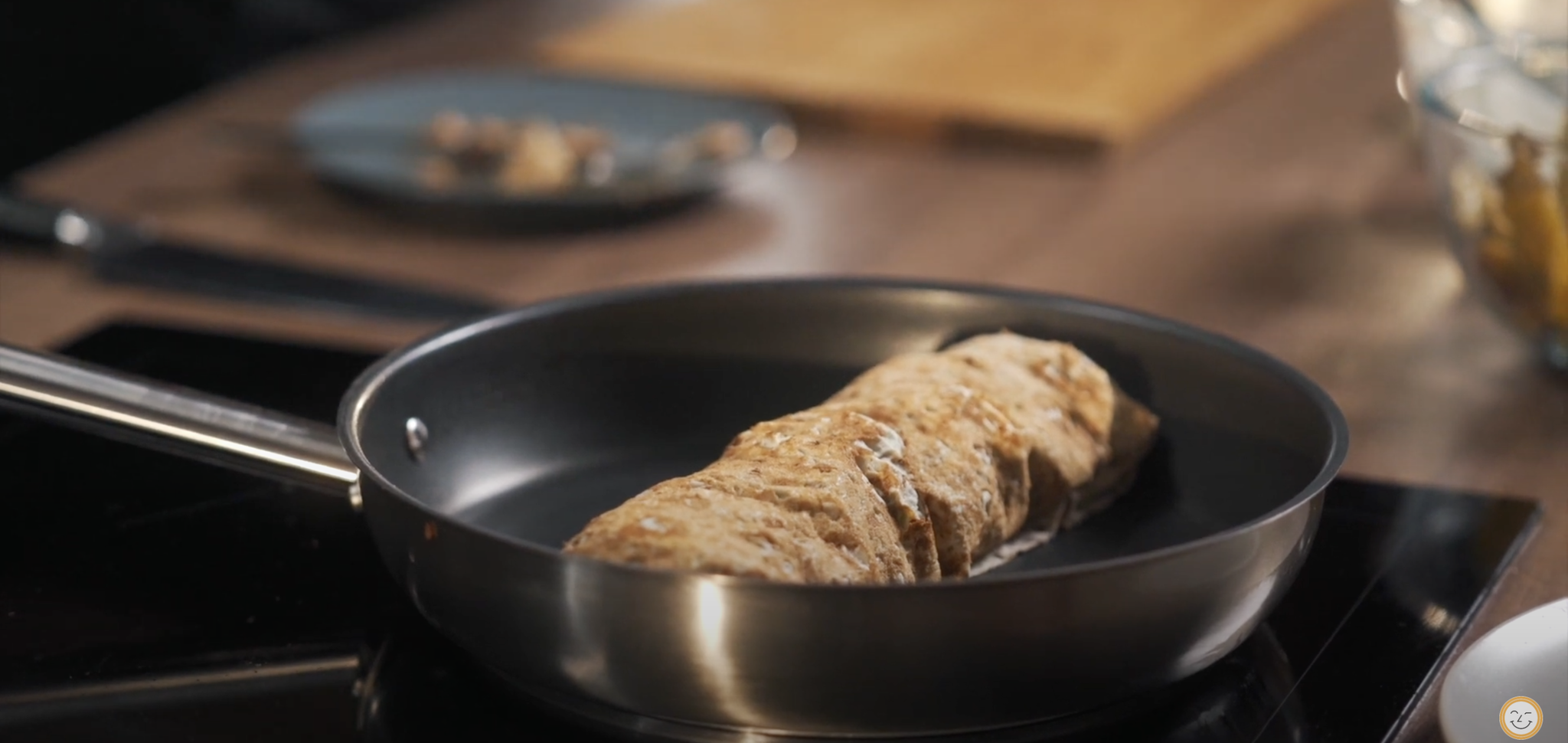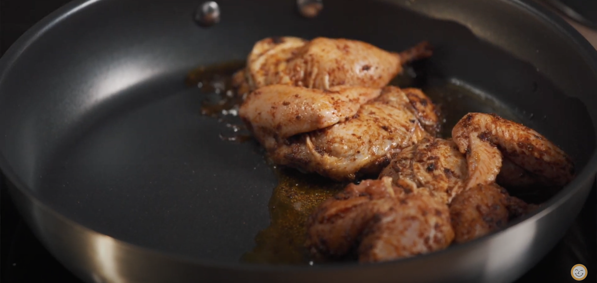 На раскаленную сковороду наливаем растительное масло, кидаем чеснок и веточку тимьяна и обжариваем курицу примерно 15 минут, до готовности. Не забываем посолить и поперчить.