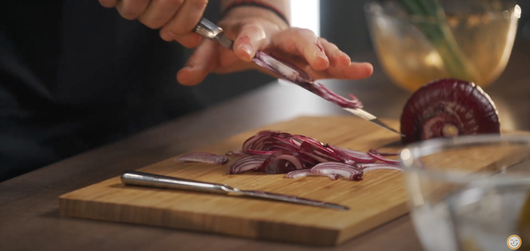 Нарезаем помидоры кружочками, а маринованные перцы и красный лук — соломкой.