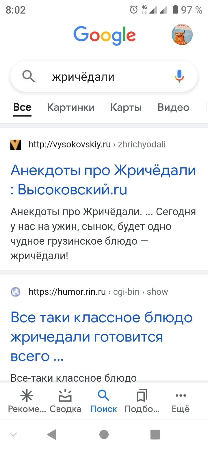 Попалось видео на Ютубе сибирячки, которая живет с французом во Франции и рассказом типа что они там все обычно едят. Она и говорит что иногда кормит мужа жричёдали. Думаю , странно, ни разу не слышала про такое блюдо, наверное, грузинское или армянское, пошла искать в гугл, не нашла- раз пять прослушала видео, тот момент, где дама называет блюдо, думаю ну наверное не расслышала, буквы не правильно написала. Снова в гугл- опять пусто. На поиски ушло минут 15. И только потом дошло - жри что дали...