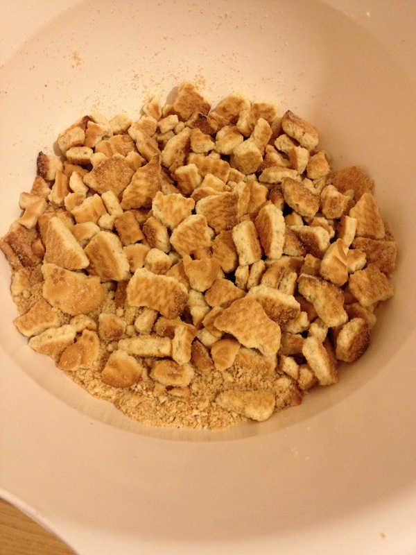 Дальше разламываем на мелкие кусочки печенье в миску, вот так: