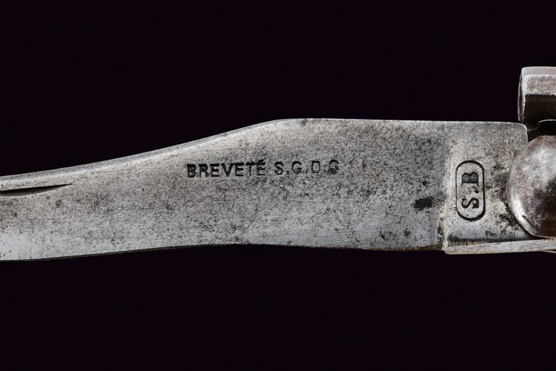 10 DenShermann Редкое и необычное оружие Револьвер со складным ножом, длина 23,2 см, Франция, около 1870 года 24 дня назад Калибр 5 мм. Ствол восьмиугольный, нарезной, с серийным номером «35хх» у основания и мушки, на складном ноже имеется надпись «BREVETE S.G:D.G.» и «S.B». Историческое фото Огнестрельное оружие История (наука) Франция 19 век Комбинирование Оружие Револьвер Длиннопост 1 1 Ещё 0