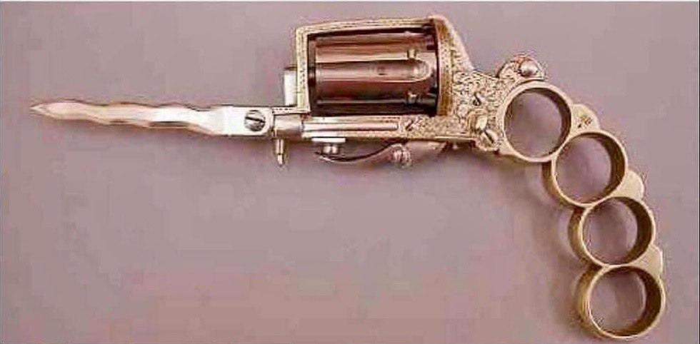 5 HistoryCenturies История Веков Револьвер-кастет-нож 19 века 1 год назад Небольшой складной револьвер 1890 г. с выдвижным штыком и кастетом. Телеграм — История Веков История (наука) Прошлое Культура Общество Фотография Старое фото Оружие Револьвер Историческое фото Редкость Пистолеты Перевод Telegram (ссылка) Ещё 0