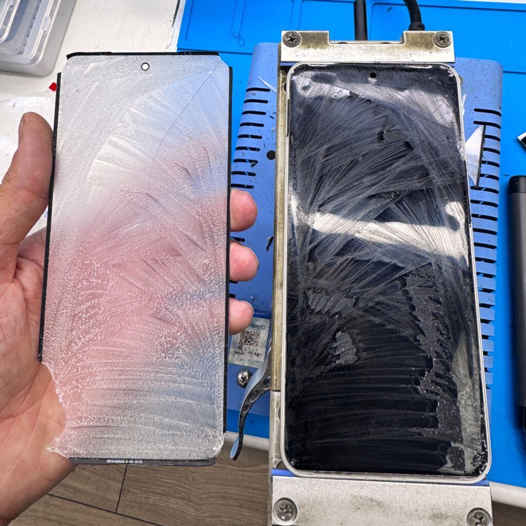 Закидываем дисплей на сепаратор, разбиваем углы алмазным диском и вытягиваем герметик.