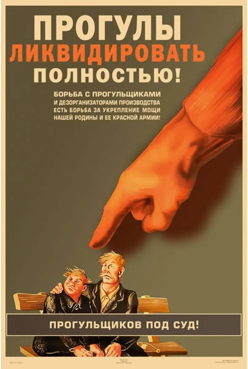 Советская система на этом не остановилась, пряники выдала, и про кнут не забыла. С 1940 по 1956 года действовало постановление «О переходе на восьмичасовой рабочий день», в рамках которого за прогул работы без уважительной причины следовало жестокое наказание в виде исправительных работ сроком до 6 месяцев с удержанием до 25% заработной платы. Прогулом считалось как опоздание на работу более чем на 20 минут, так и несвоевременное возвращение с обеда или перекура. Нарушившим дважды уже грозил реальный тюремный срок, что в наше время звучит как то дико. За этот период почти 18 млн человек провинились и попали под раздачу (1/6 взрослого населения, между прочим).