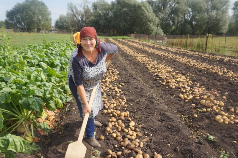 Взял ведро, бросаю картоху на землю. Тесть с тёщей и дяди с тётями нагребают курганы.