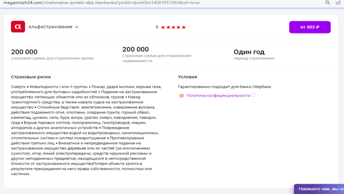 Стоимость полиса ипотечного страхования на 1 год - от 502 руб. (при страховой сумме 200 тыс.)