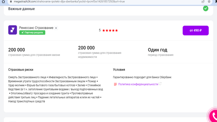 Стоимость полиса ипотечного страхования на 1 год - от 490 руб. (при страховой сумме 200 тыс.)