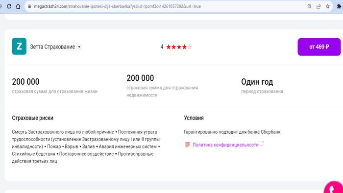 Стоимость полиса ипотечного страхования на 1 год - от 469 руб. (при страховой сумме 200 тыс.)