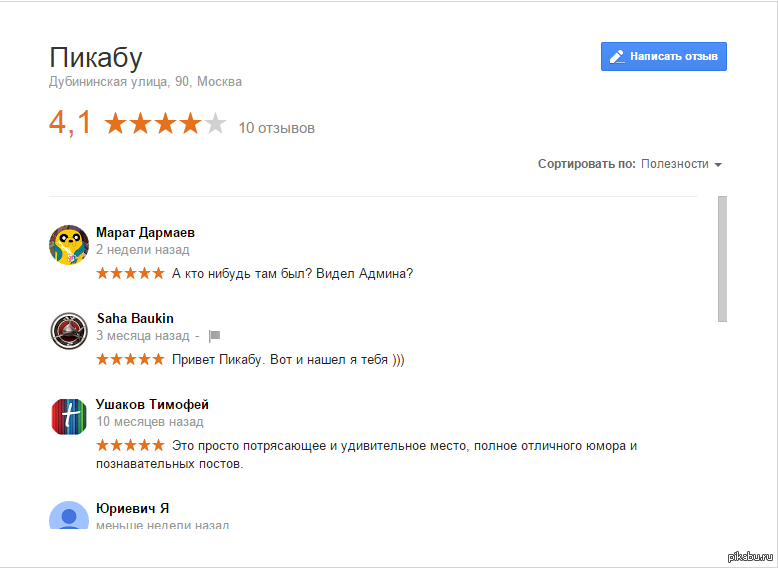 NikiMuller 10 лет назад Рейтинг, Отзывы о пикабу))) По запросу "Пикабу" гугл выдал московский адрес, судя по отзывам там еще не кто не бывал))) Пикабу Скриншот Отзыв Google