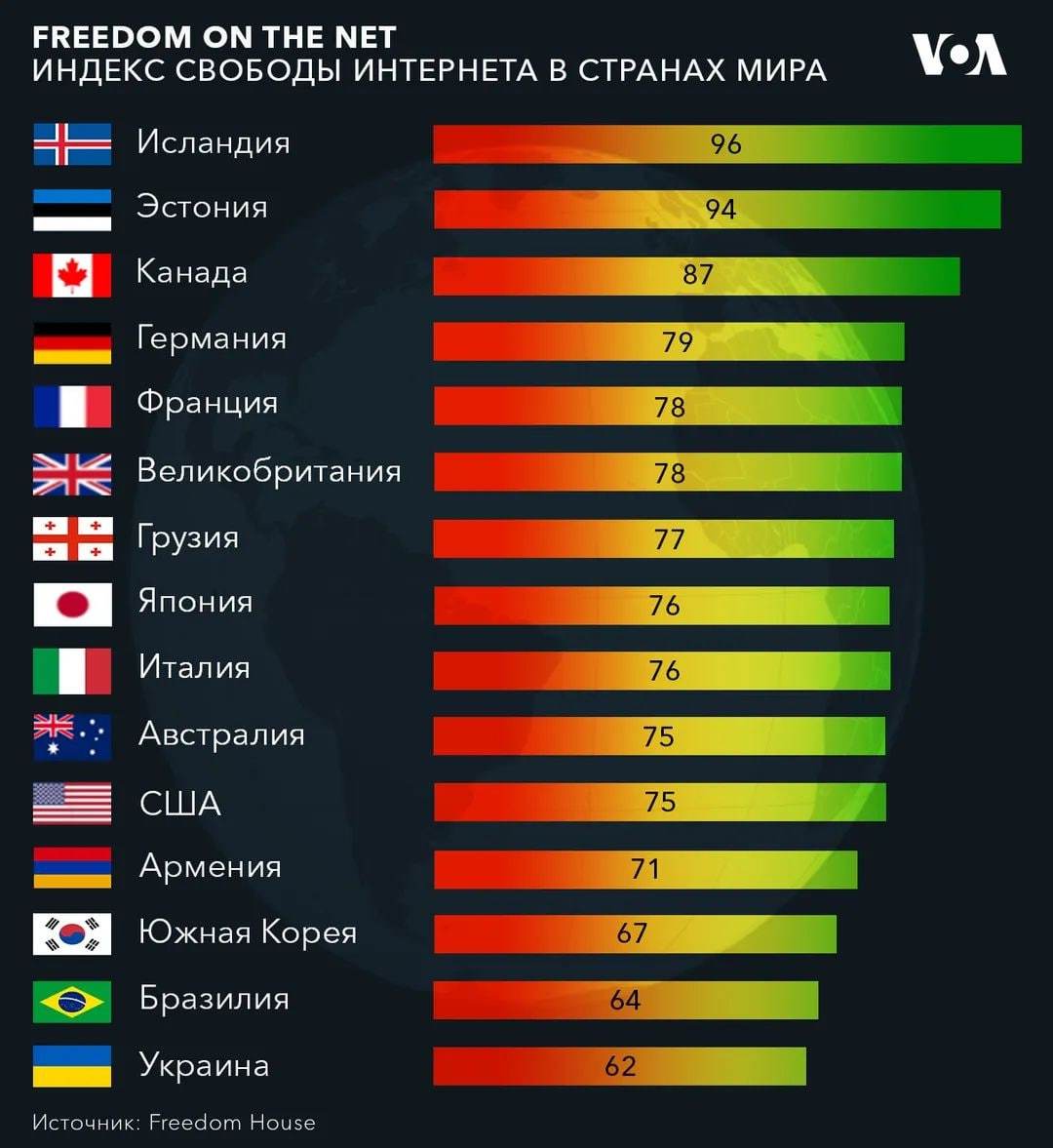Самый свободный интернет - в Исландии (0,96) и Эстонии (0,94). Самая жесть - в Китае (0,10), Иране (0,16) и Мьянме (0,17).