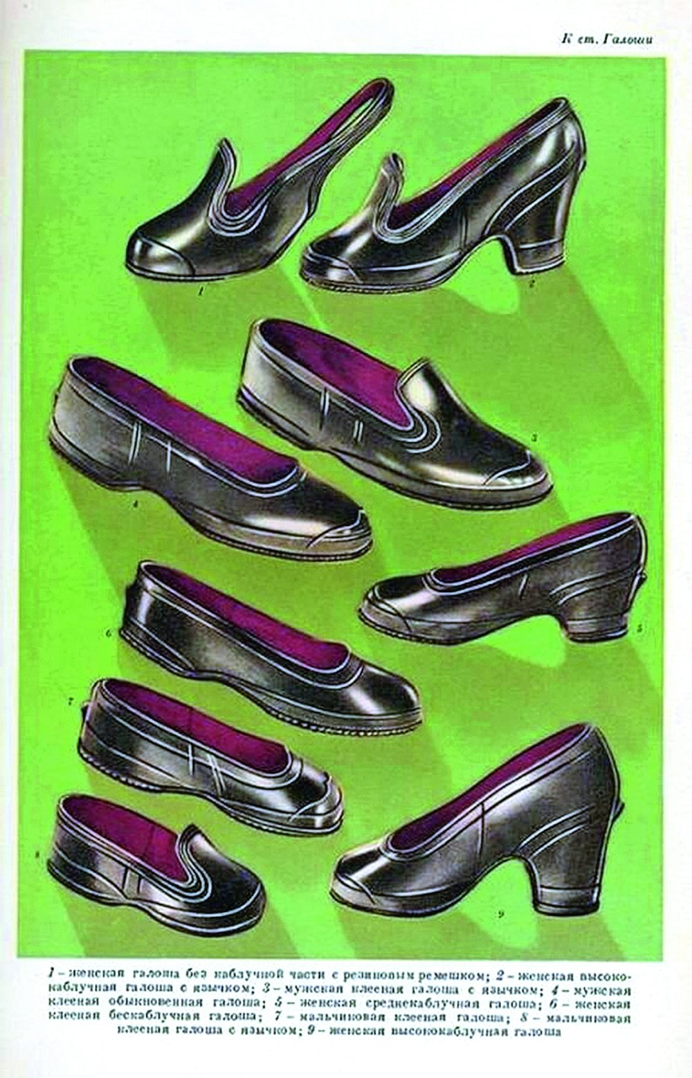 На прилавках магазинов являлись поражающие воображение образцы женской резиновой моды шестидесятых - галоши средне - и высококаблучные, с язычками и без oныx, резиновые изделия, похожие нa босоножки с оторванными каблуками и разумеется, тупоносые калоши