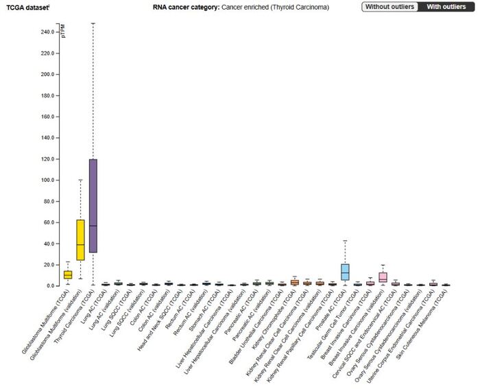 Рисунок 3. Уровень мРНК PDE8B повышен при различных типах рака, но особенно повышен при раке щитовидной железы, что, вероятно, отражает ее роль в передаче сигналов ТТГ/Т3/Т4 (Атлас белков человека).