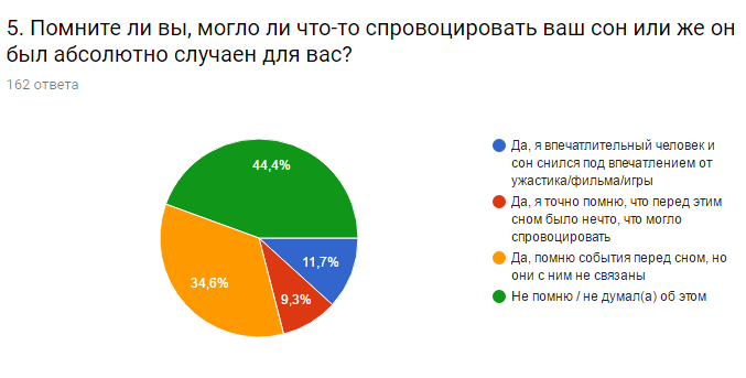 90 человек (опять же, данные с Google форм, поэтому без округления, все честно) проводили самостоятельный анализ снов и из них 56 (62% из 90, или 34.6% от общего количества) отметили, что прошедшие события совершенно не связаны со снами. Остальные 34 человека (38% от 90 и 21% от общего числа соответственно) сообщили, что связь со снами имеется, при этом 19 человек признались в своей впечатлительности и в том, что сны были вызваны фильмами или книгами.