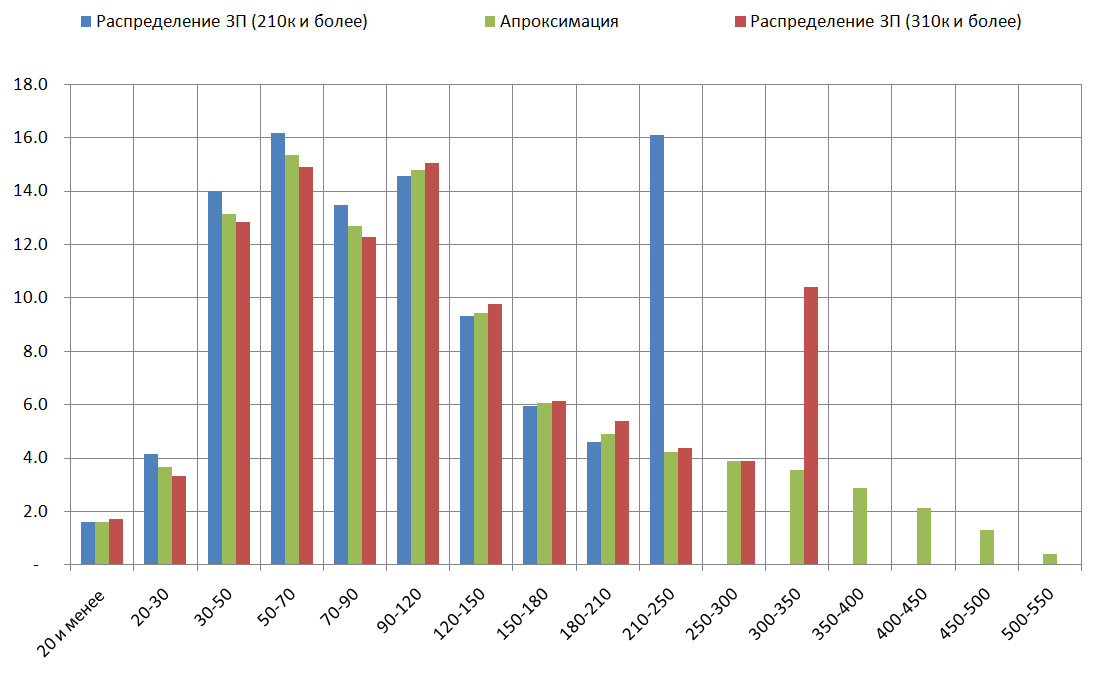 Медианная зарплата по верхним 20% находится где то чуть за границей измерения в 310 000р или больше. Точнее не сказать.