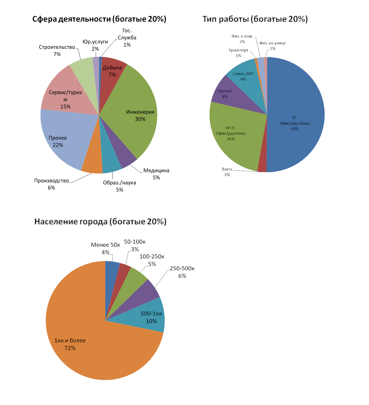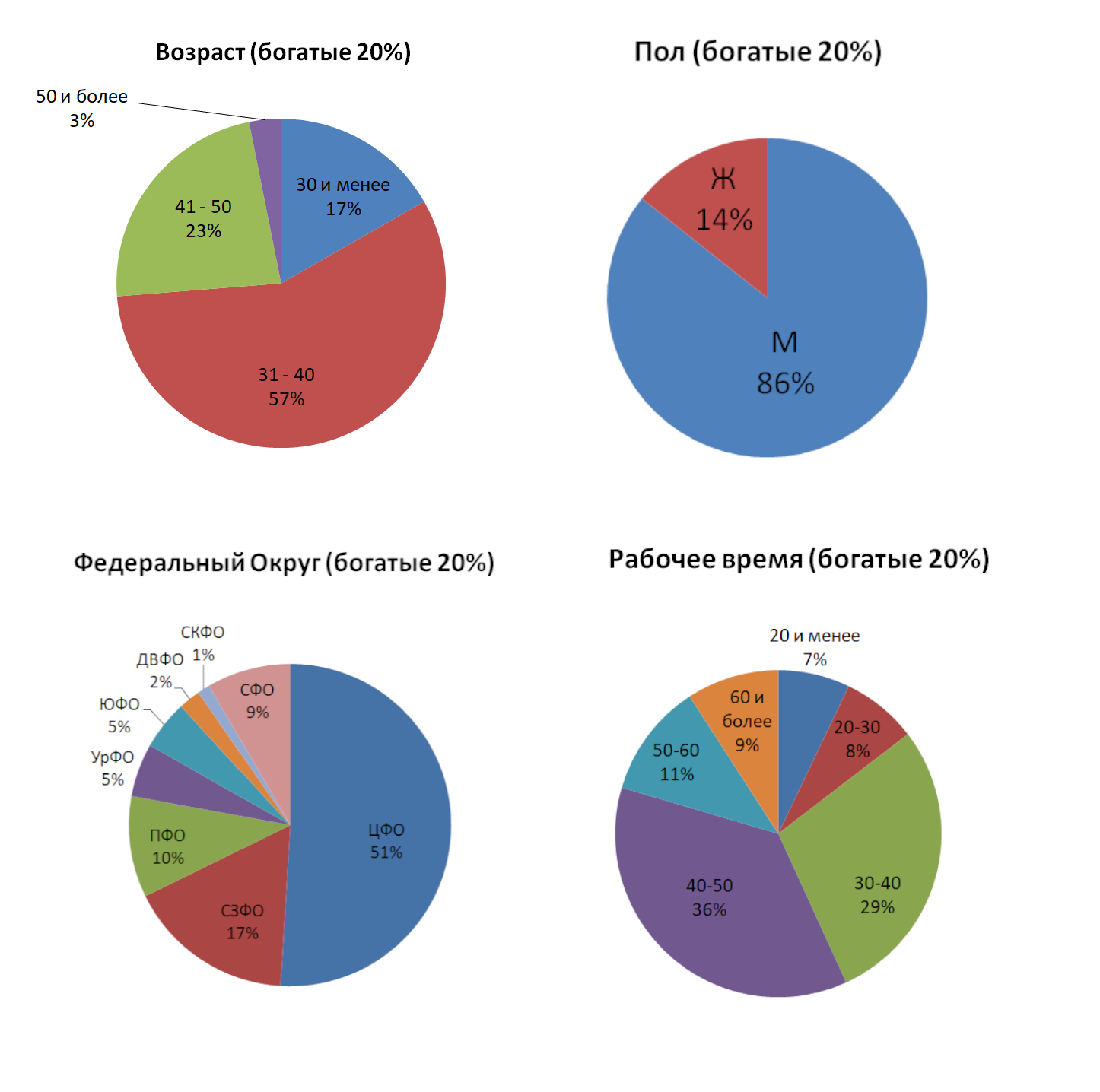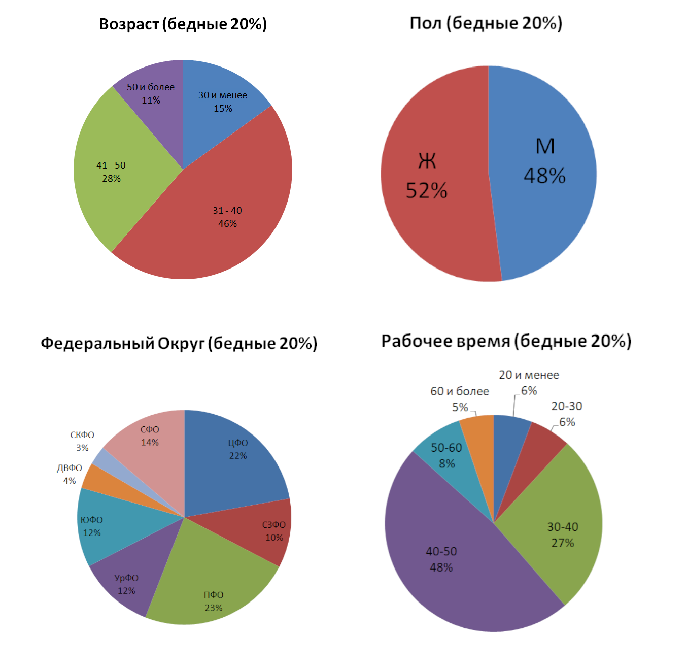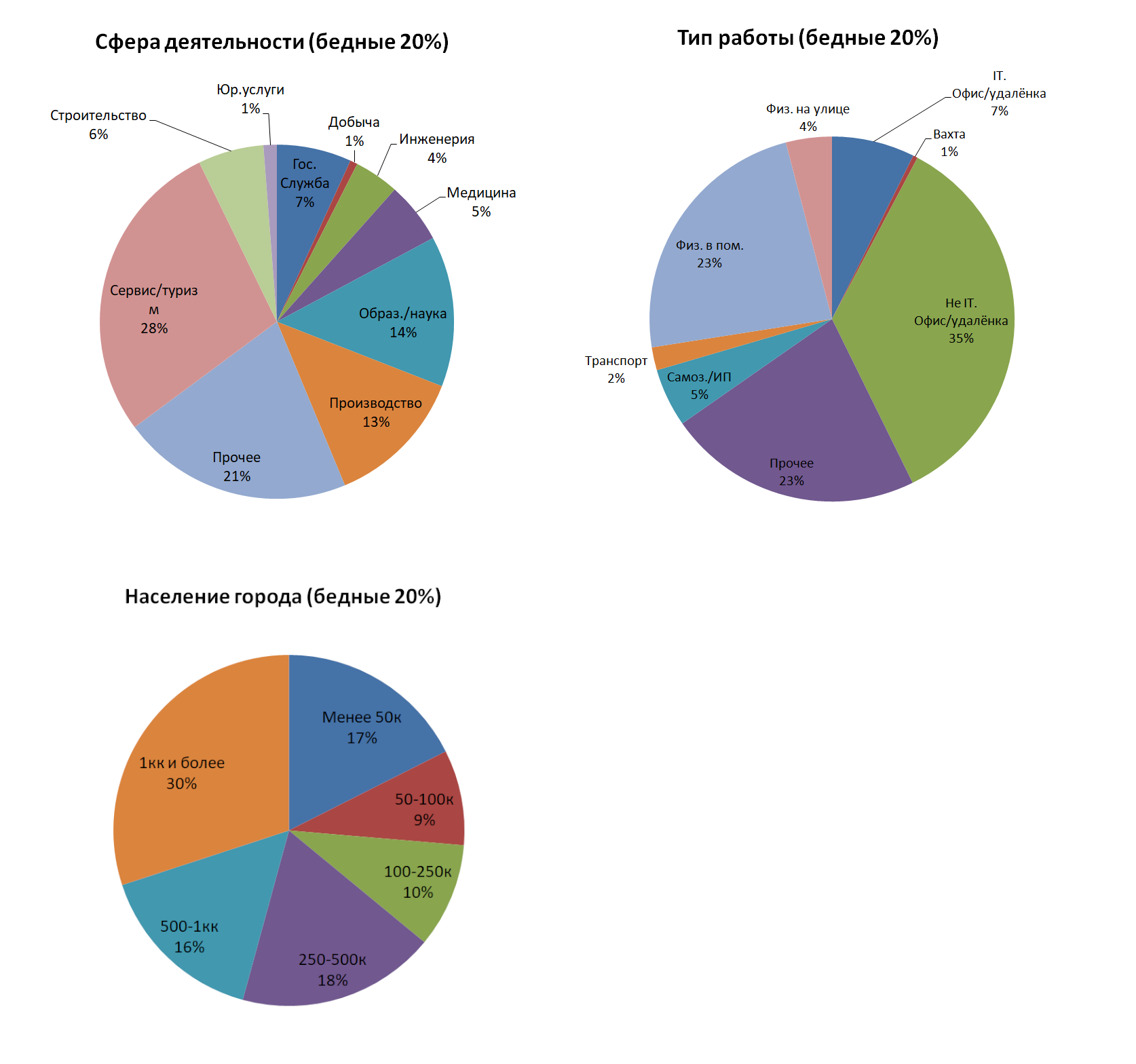Вторая часть отчёта. Тут я отделил верхние 20% по доходам и нижние 20%. Почему именно 20%? Это хорошо легло на выборку. Ещё я подписал рисунки как бедные/богатые, сейчас понимаю что звучит грубовато, но прошу простить. Долго переделывать.