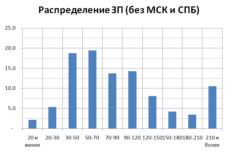 Тут можно сделать промежуточные выводы и отметить, что медианная зарплата по всей выборке находится в интервале 90 000р - 120 000р.