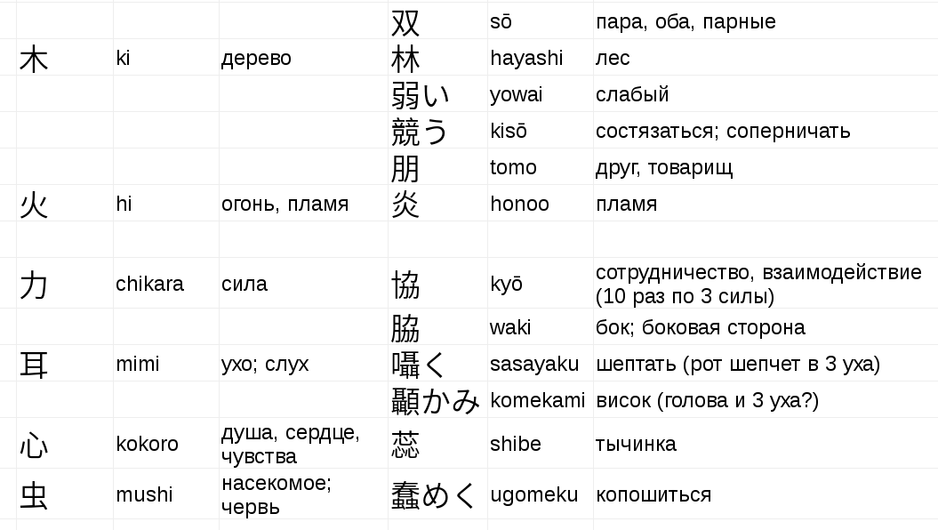 Внезапно заинтересовался японскими иероглифами, состоящими из одинаковых радикалов.