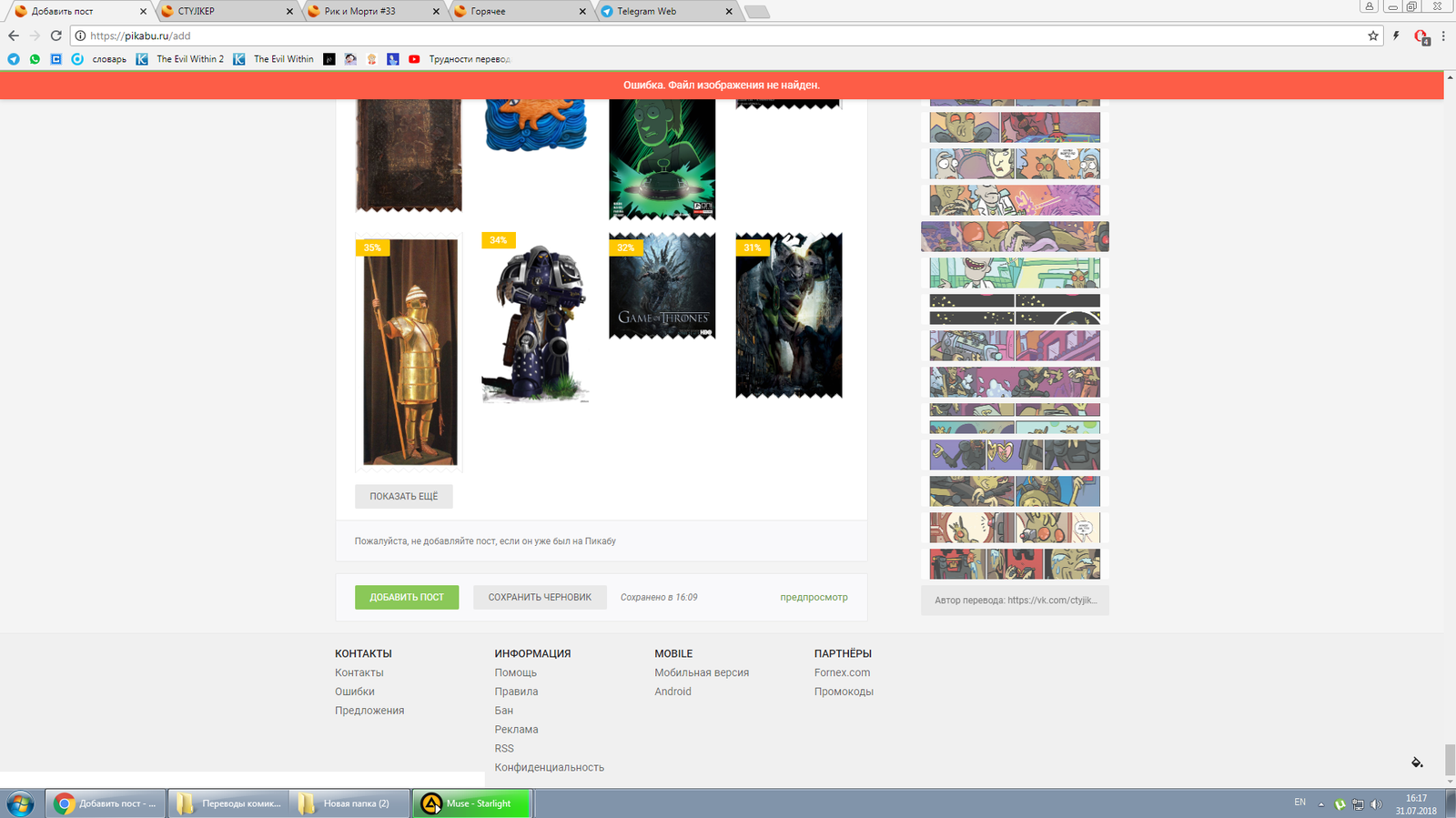 Конструктор не даёт создать пост, выдавая сообщение "Ошибка. Файл изображения не найден."(скриншот #1). Кэш/историю/куки браузера (Chrome 67) почистил, изображения на ПК переместил в другое место. Также при сохранении черновика этого поста конструктор теряет одно изображение. В предпросмотр поста не пускает, выдавая всё тоже сообщение об ошибке.