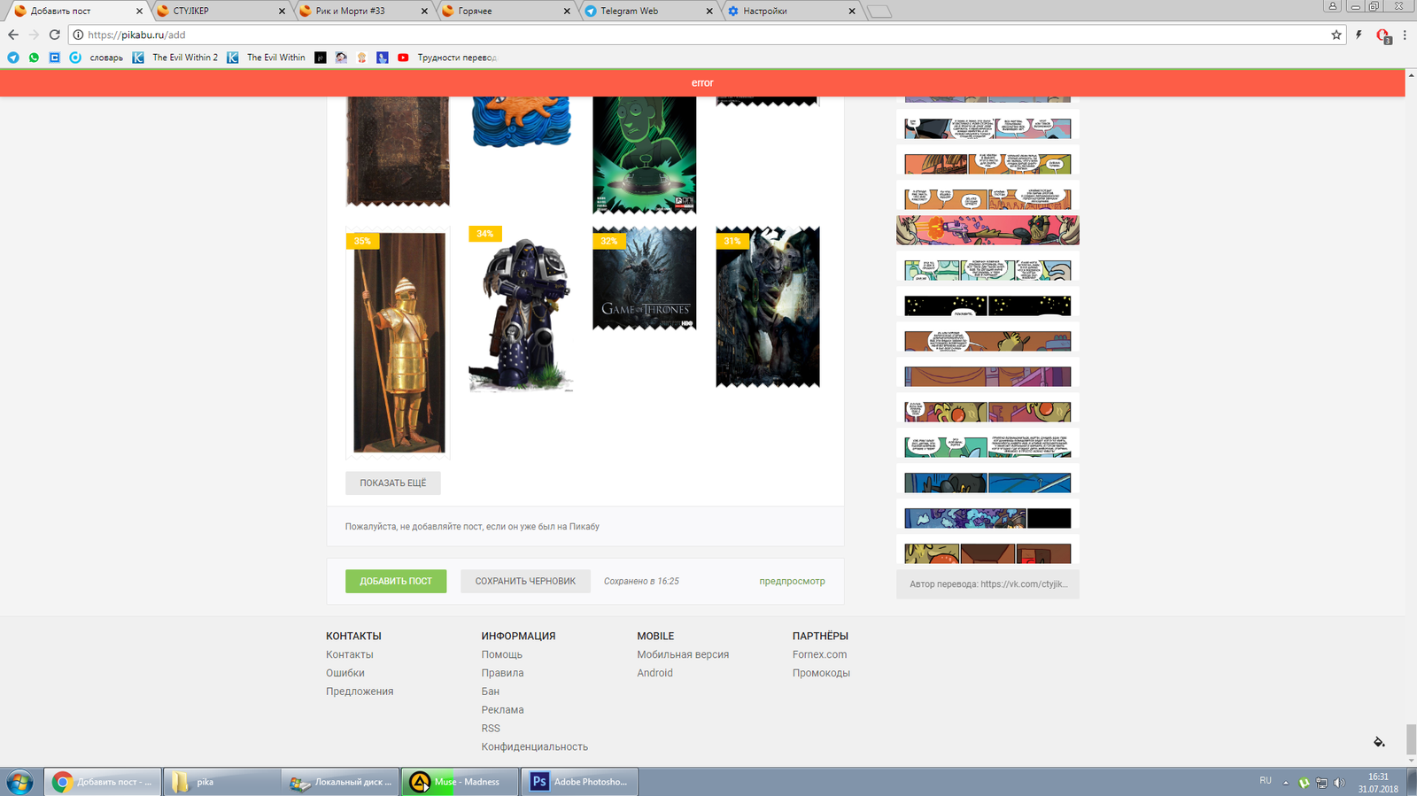 Upd: попробовал пересохранить теряемое изображение, заменил его в посте, началось создание, но в итоге увидел ещё более непонятное сообщение "error" (скриншот #2).