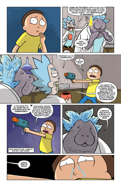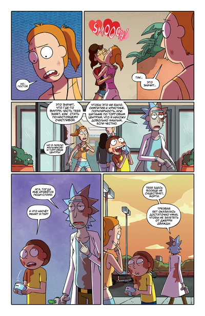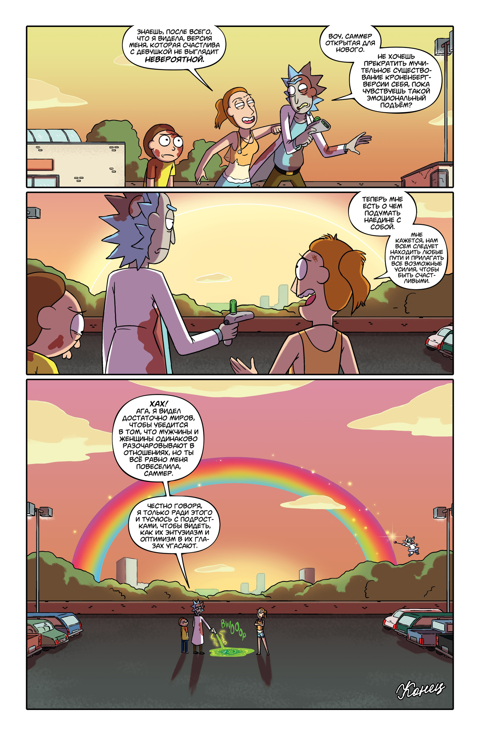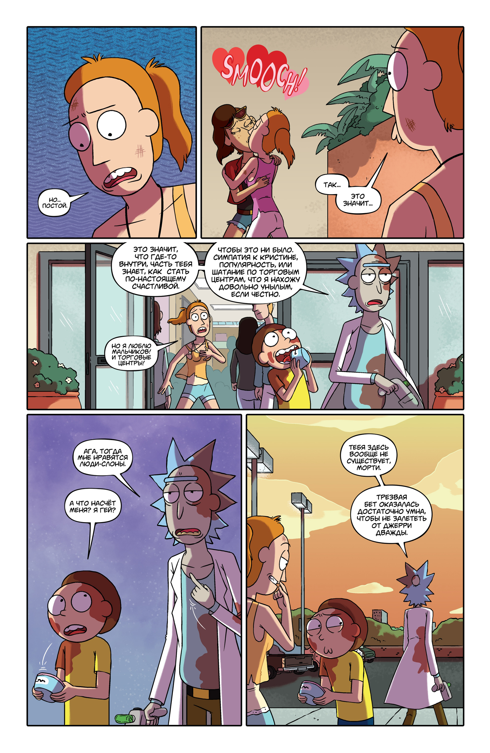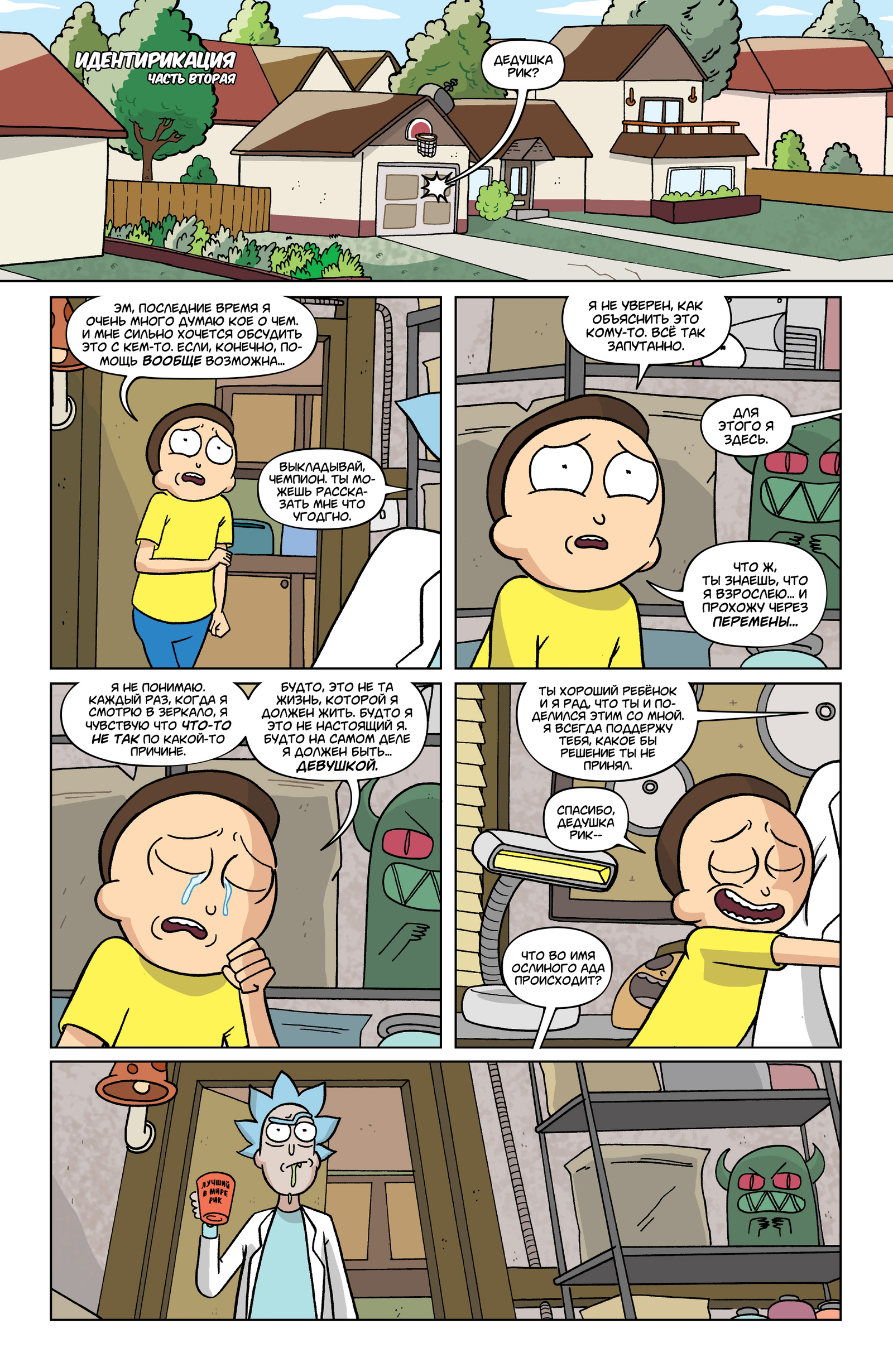 Первая (Маловероятная) - Рик с помощью своей мозго-сменяющей пушки изменил личность (и похоже тело) Саммер, что та теперь считает себя Морти, от сюда и чувство, что он не в своём теле, а в конце комикса Рик на это намекает и Морти-Саммер всё понимает