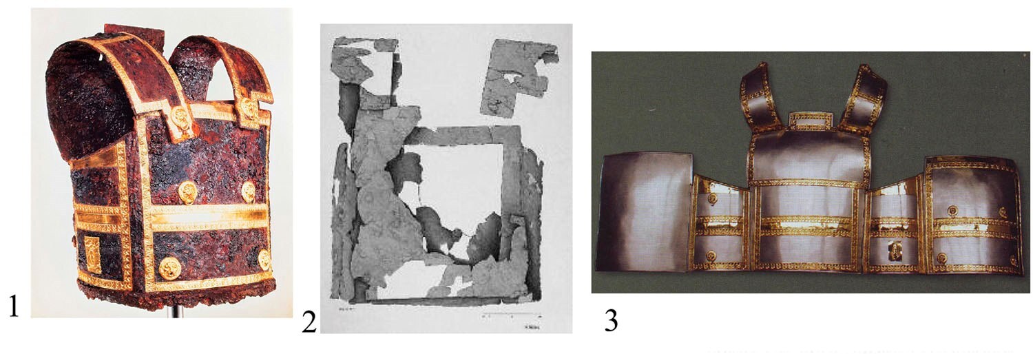 1 – панцирь из гробницы II Большого кургана в Вергине, 336 или 317 гг. до н.э. [Andronicos, 1989. P. 139. Ill. 96]; 2 – панцирь из гробницы III в Айос Афанасиос, последняя четверть IV в. до н.э. [Τσιμπίδου-Αυλωνίτη, 2011. Σ. 355. Εχ. 1]; 3 – реконструкция панциря из Вергины (Иллюстрации и подписи [3]