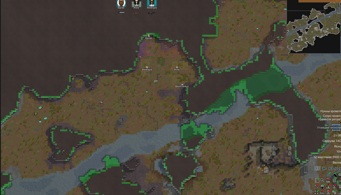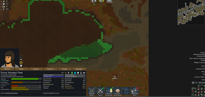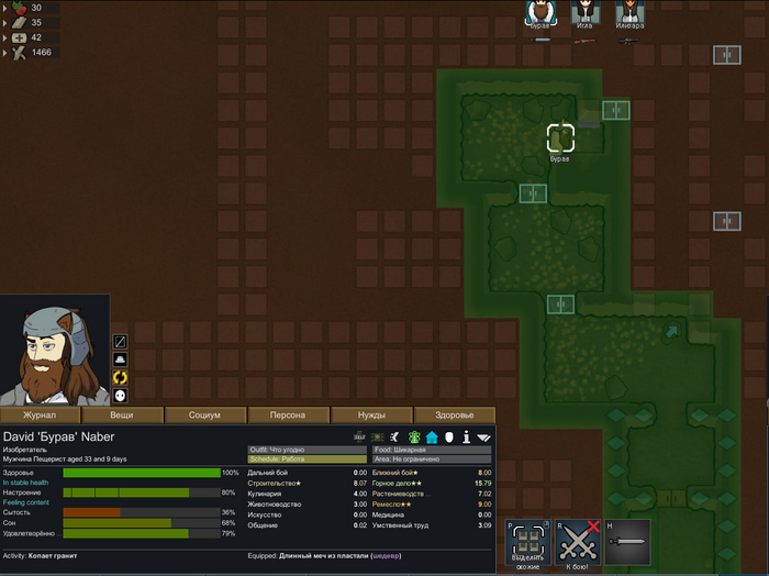 Расставили приоритеты строительства базы: из всех помещений самые главные - кухня (сухпайков надолго не хватит) и склад провизии (на воздухе мясо быстро придёт в негодность). Спальни и столовая немного подождут. Но и дневать под солнцем не лучшая идея - пока перед второй днёвкой разместим спальные места на полу будущего шлюза, и хоть как-то в нём приберёмся. И на будущее отметим, что стены шлюза ни в коем случае не меняем на кирпичные, а выравниваем - прочнее полированного природного гранита только руды, а стены из руд это редкость несусветная (руды идут в переработку). Полировка, конечно, не добавит прочности стенам, но хотя бы даст возможность их ремонтировать и прокладывать в них коммуникации. Конечно, это процесс очень долгий, и пока обойдёмся просто неровным природным камнем, но будет Бураву делать нечего - вот и выровняет.