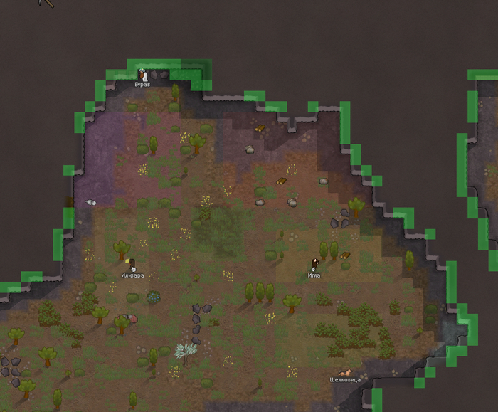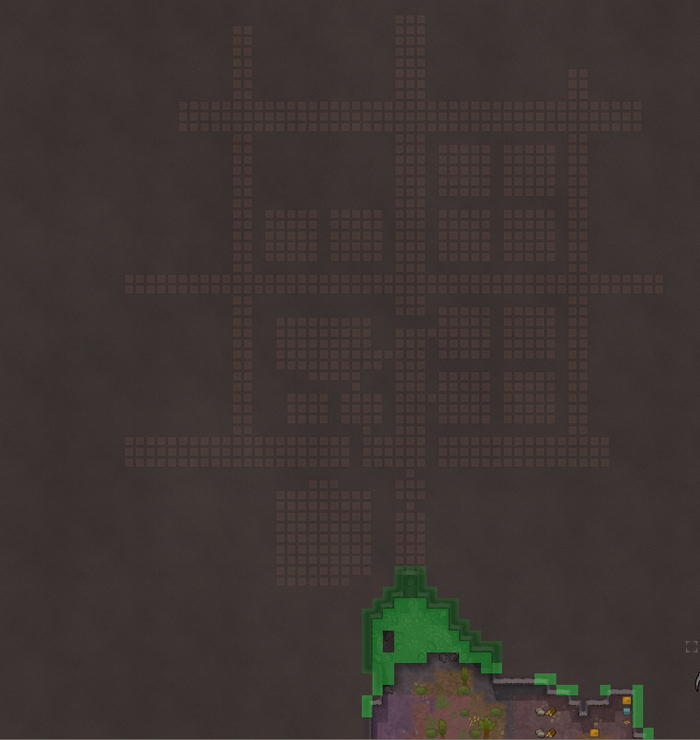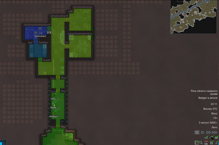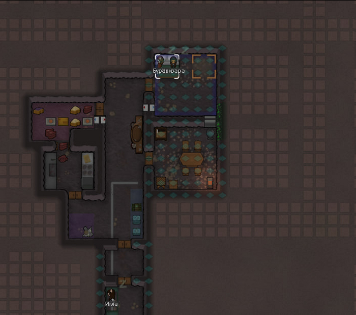 Бурав только-только прокопал поверхностный слой гранита и добрался до коренной породы, как солнце совсем разморило нас - пещерных жителей, не привычных к яркому свету. Пришлось лечь отдыхать до заката, и пока отдыхали, строить планы. Распределили работу - Бурав копает и строит, Лиза готовит и растит, Игла охотится, поддерживает порядок и как появляется мастерская - занимается производством. В случае болезней лечить и ухаживать дамы будут вместе. Накидали план базы (а то пока было "докопаемся до толстого слоя горной породы над головой, а потом посмотрим"): коридор с юга на север, начинающийся шлюзом (в мирное время защитит от жары или мороза, в военное - может быть одним из рубежей обороны). Далее стандартная квадратная решётка: слева склад длительного хранения продуктов, кухня и разделочная комнатка, за ними оборотный продуктовый склад. С другой стороны коридора - жилые комнаты, на первых порах достаточно двух - Игле и Буру с женой. А ремеслом (до поры до времени только камнетёсным) можно и в коридоре позаниматься (он большой, сразу на вырост). Понятно, что планы наполеоновские, выделили первый этап - кухня, за ней холодильник, справа жилые помещения, а всё остальное потом.
