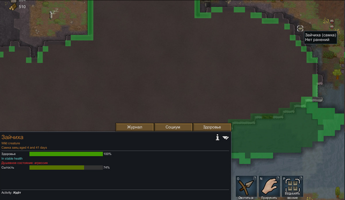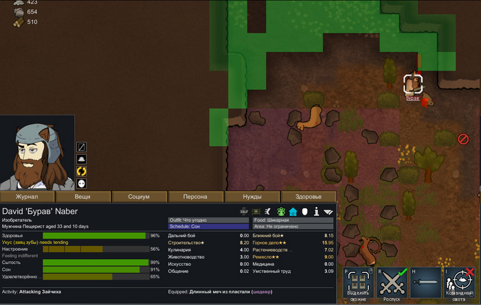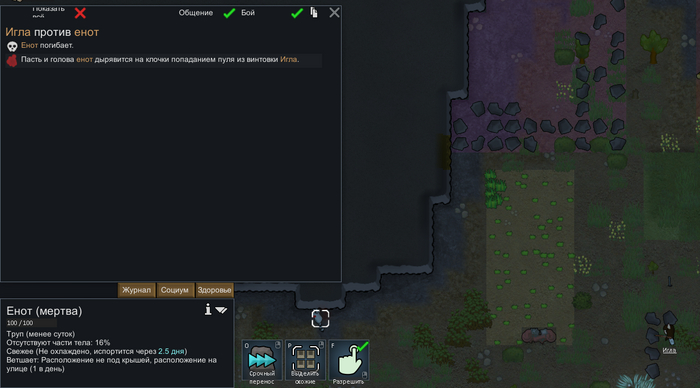 Пока мы спали, в наши окрестности забежала бешеная зайчиха. Но пока мы спим за закрытыми дверями, а вечером, как встанем - Бурав сходит с ней разобраться - он в броне, заяц прокусить не должен... Или лучше Иглу отправить - она без брони, но с винтовкой, и стрелок знатный... Посмотрим, будет ли заяц сразу у двери - тогда Бурав, или на расстоянии - тогда у Иглы будет время, пока он будет подбегать. В общем, вечер утра мудренее.