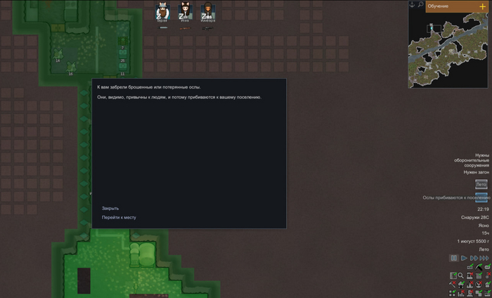 Наверное стоит немного отвлечь Бурава от бурения, и построить загон - пока лето - ослы себя прокормят сами. Придёт зима - посмотрим, успеем ли мы наладить производство пищи (и соответственно комбикорма) или пустим их самих на прокорм. Если всё будет благополучно -транспорт нам нужен будет: мы же вливаться в местное общество через торговлю собираемся.