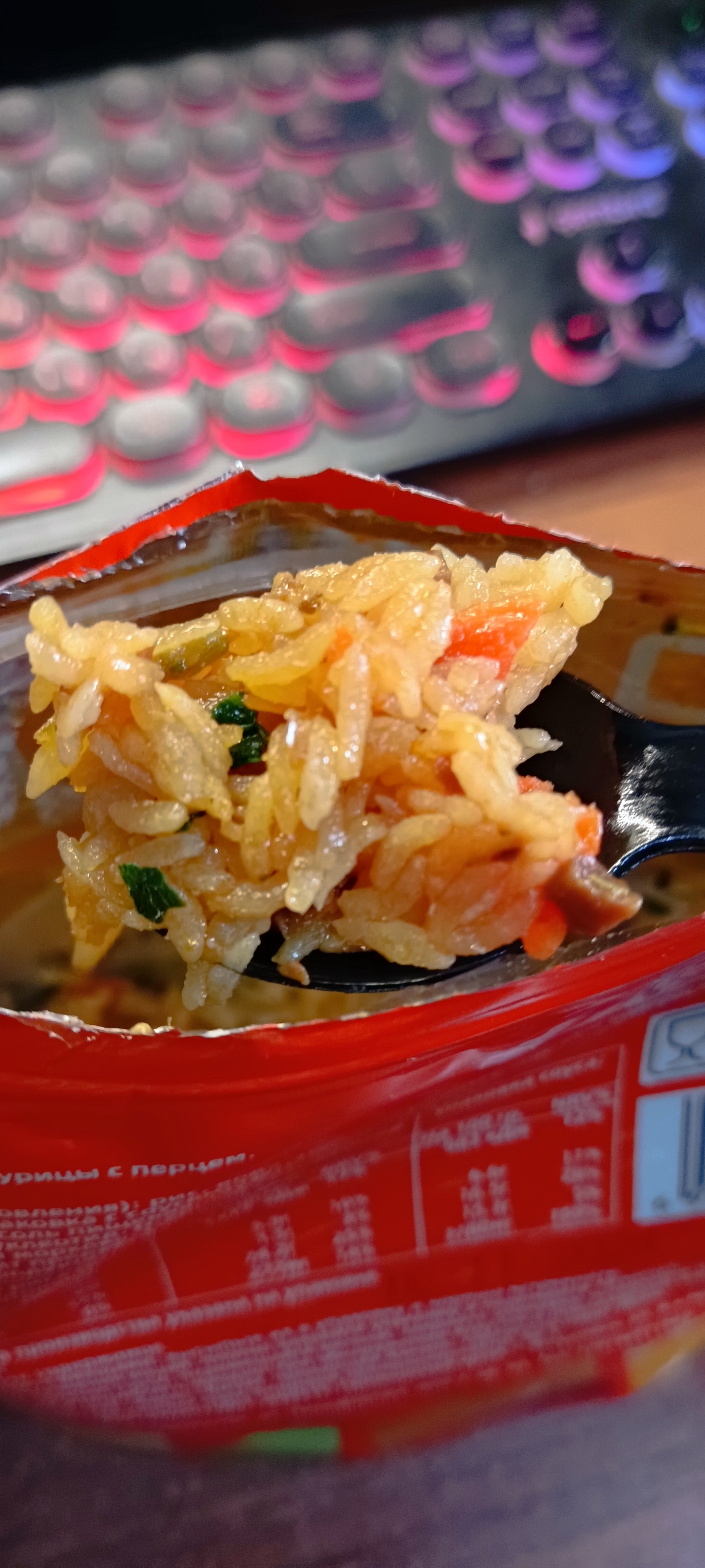 Нос почувствовал сразу ни с чем не сравнимый запах и вкус сычуаньского перца, чеснока и где то вдали чувствовалась курица, словно жирком от жаренной курицы полили. Острота 1/10, подойдет для тех кому доширак это то что острое. На вкус очень достойное блюдо и однозначно можно рассчитывать как замену надоевшей лапше(но не постоянную!) Очень вкусный, сытный гарнир, рис хорошо приготовился, как и овощи, 300 грамм риса дают насыщение на часа 2. Однозначно рекомендую как если лапша приелась или вы её не любите вовсе! Настоящее открытие для любителей риса!
