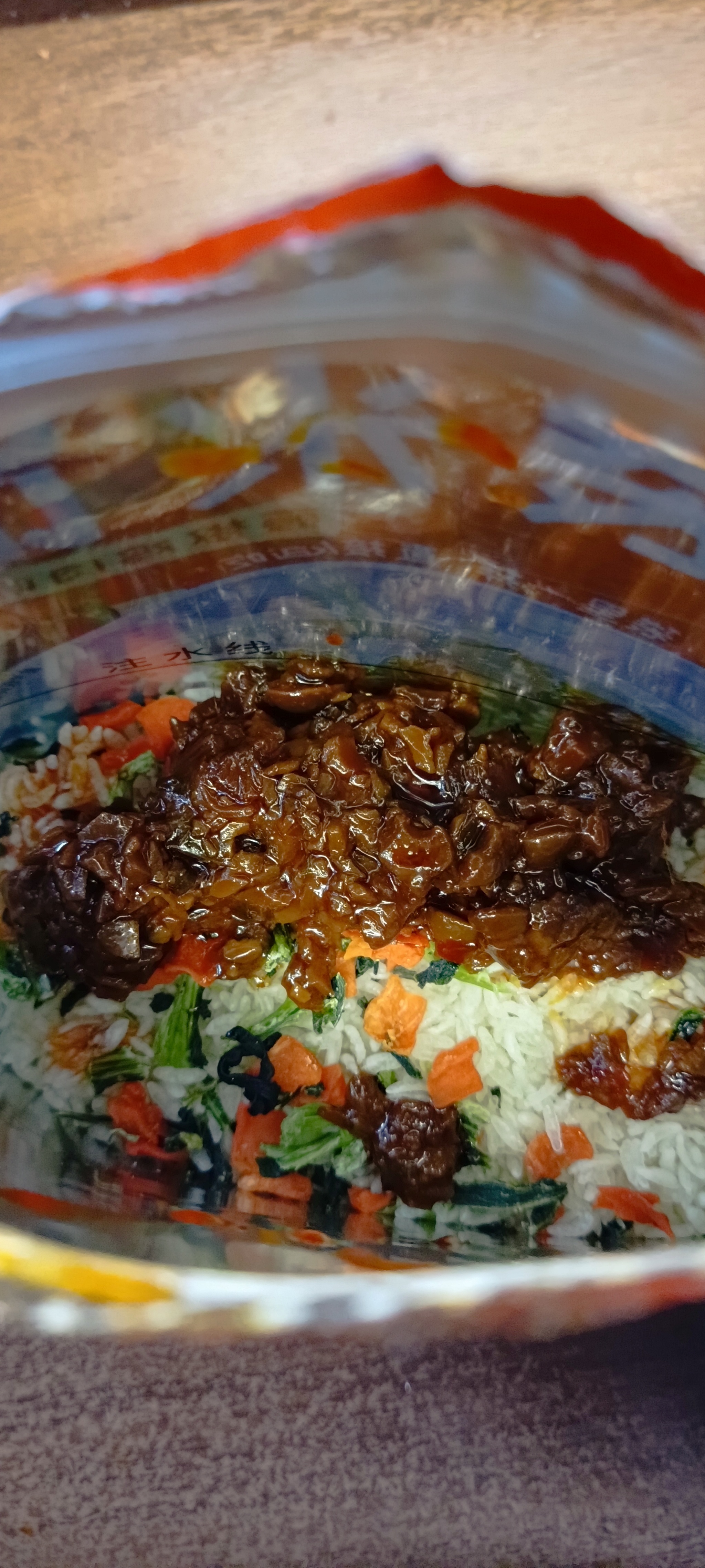 высыпаем, выдавливаем к нашему рису остальные два пакетика и заливаем кипятком. Залив- закрываем пакет зип-лок замком и с подозрением ждём 5 минут.