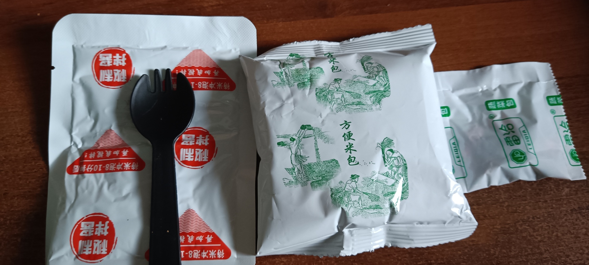 Внутри пачки нас с радостью встретили 3 пакетика и ложковилка из достаточно плотного пластика. Маленький пакетик — овощи, пакетик с прекрасным искусством, на котором изображено, каких усилий стоит добыть рис для нашего обеда, и соус.