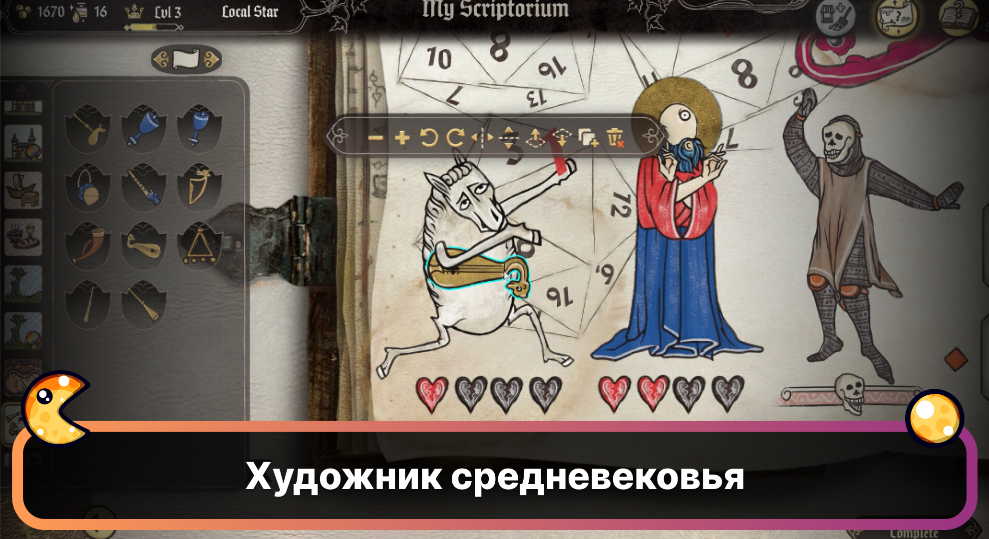 Кампании с клиентами: Вы получаете заказы от рыцарей, монахов и даже учёных мышей. Задача — заполнить страницу, следуя требованиям вроде «вставить пса» или «заполнить определённую зону». Инструменты базовые, но дают свободу для творчества.