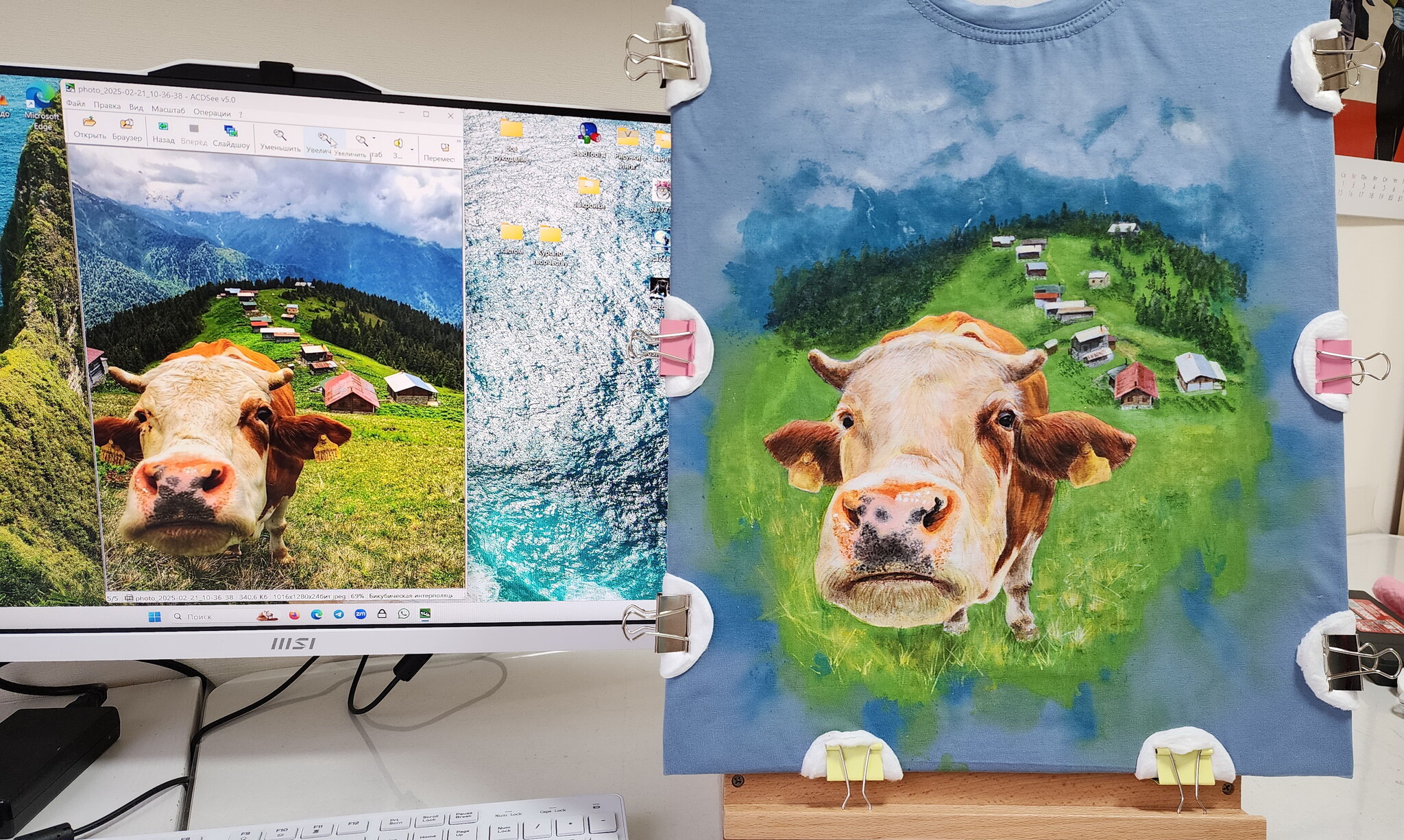 Рисунок на футболке "Любопытная корова" по фото заказчика. На оригинальном фото плато Pokut, Турция.