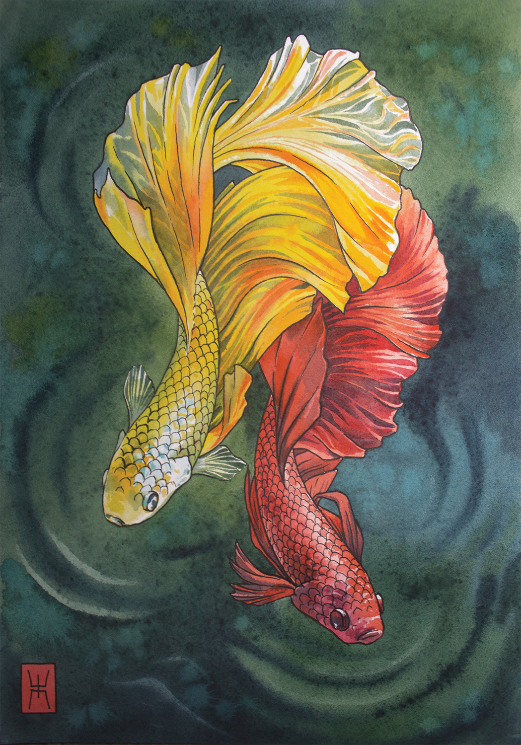 Петушки. Акварель, хлопковая бумага А4, линеры. 2020г. Оформлена в раму и паспарту. 100т.р.
