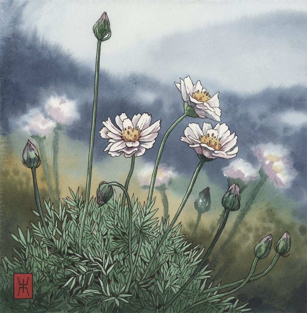 Горные цветы. Акварель, хлопок 21х21см, линеры. 2023. Оформлена в раму и паспарту. 50т.р.