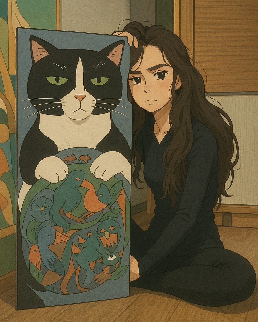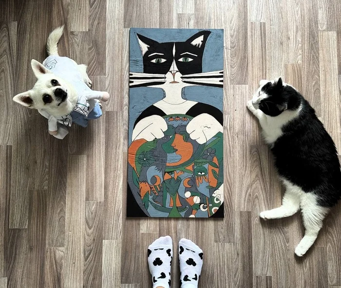 А у нас новая картина. Покажу немного свое виденье... Кот с зелеными, мудрыми глазами как будто внутри него целая вселенная, он держит земной шар ( Аккуратно , как будто защищает внутренний мир) Сюда же можно прибавить заботу о внутреннем ребенке, про отстоять свои границы ) Сильно контрастная палитра, это как спокойствие и тревога.( как в целом наша жизнь взлеты и падения :) Ну а в целом картина была создана как оберег:)