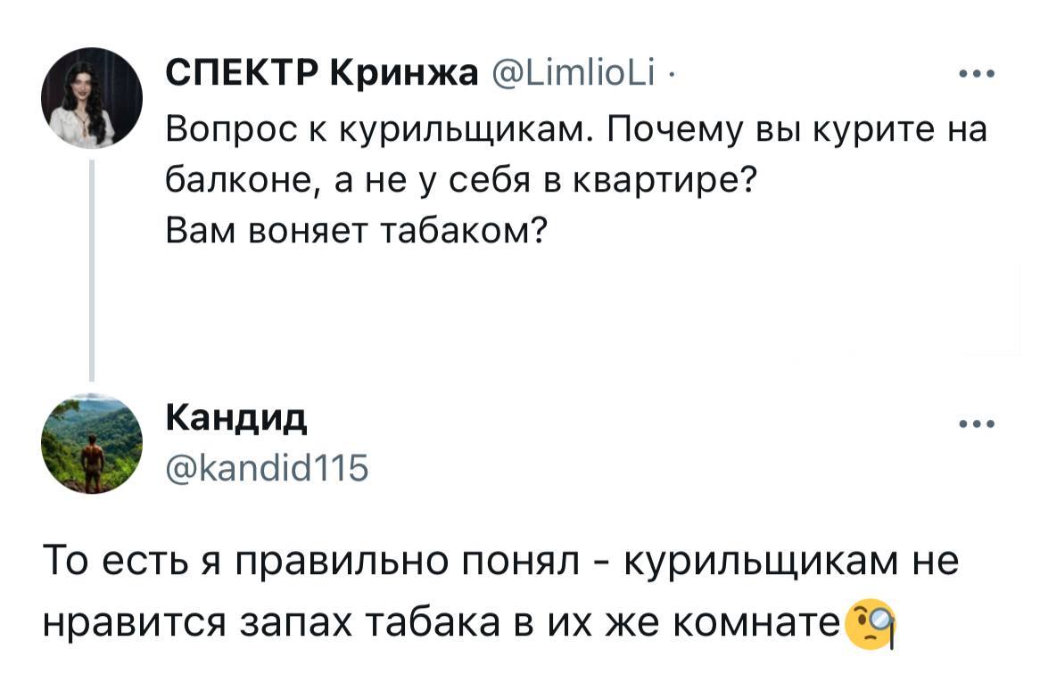 1386 terebiata Мемы. Лучшее Юмор Риторический вопрос2 8 месяцев назад Источник - https://t.me/roflemem/5763 Юмор Скриншот Курильщики Курение Telegram (ссылка) 45 37 10 3 Ещё 0