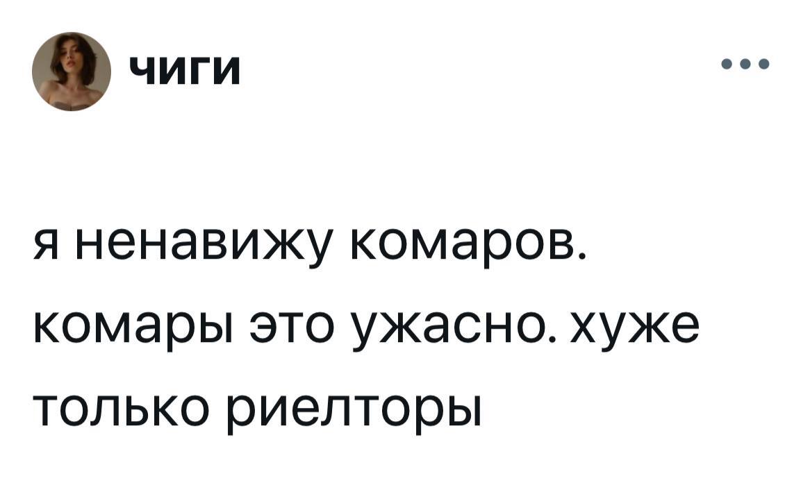 33 terebiata Мемы. Лучшее Юмор Риэлторы хотя бы не пищат ночью в моей спальне1 6 месяцев назад Источник - https://t.me/roflemem/6113 Юмор Скриншот Комары Риэлтор Ненависть Telegram (ссылка) Ещё 0