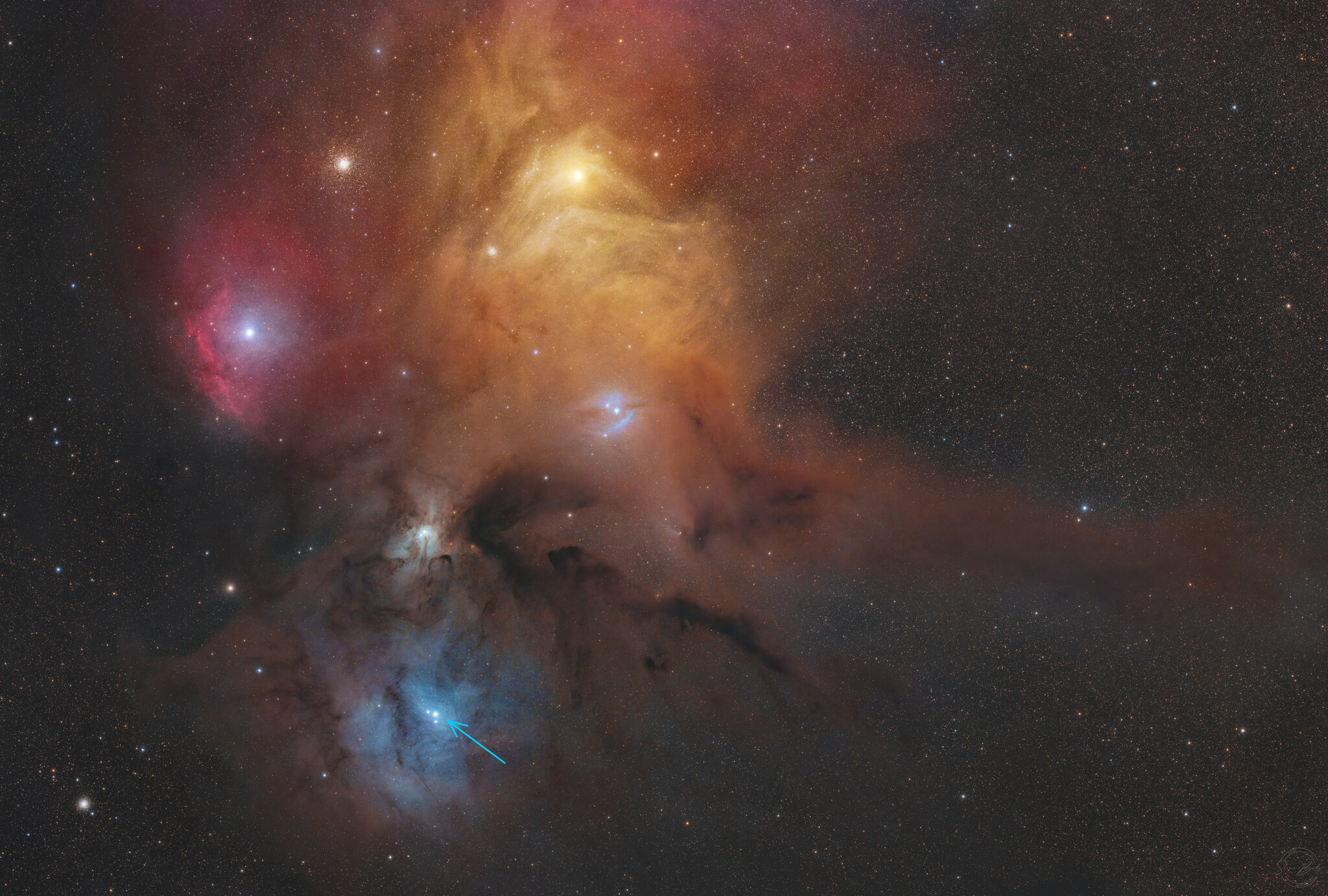 Стоит сразу сказать, что изображение перевернуто - относительного того, что видно глазом, в бинокль, трубу или на звёздной карте. Телескопы переворачивают изображение (хотя, не все и не всегда), а для астрокамер такого понятия вообще нет - там ориентация снимка всецело зависит от прихоти фотографа. Но Стиву Бади захотелось так - он же всё-таки живет в Австралии. И звезда, расположенная в северной части данного региона, оказалась в самом низу кадра.