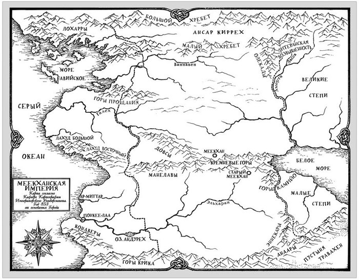 С севера империя уткнулась в непролазные горы, ведущие к ледникам, на которых окопались последние из аг’хеери – нелюдей, некогда обитавших в захваченные южанами долинах; с юга – в горы же и пустыню Травахен, населенную упоротыми иссарам – людьми, отчаянно копирующими фрименов; с востока Меекхан столкнулся с местной Великой Степью, и местными же монголами – секохландийцами. Эти ребята, кстати говоря, где-то за четверть века до описываемых в книге событий, едва не срыли империю под основание, и лишь военный гений генерала Генно Ласкольника, да упертость меекханцев, умудрявшихся превращать в крепость каждую более-менее подходящую для этого кочку, помогли не только выстоять, но и прогнать врагов за пределы государства.