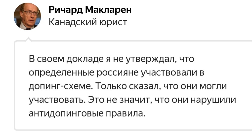 В частности, Макларен сказал, что перепроверял показания Родченкова через неназванных информаторов. Он мотивировал это тем, что уточнял сведения конфиденциально и назвать их имена не может. А вот электронные документы на русском языке, которые легли в основу скандальных докладов, Ричард Макларен дал перепроверять экспертной группе. Однако во время дачи показаний он не смог назвать имя эксперта, который перепроверял сведения от Григория Родченкова.