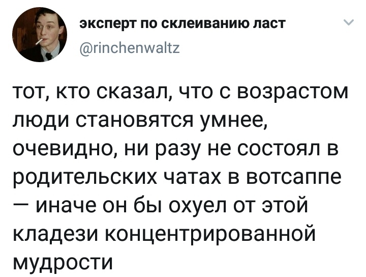 Я админю вайбер-чат нашего класса и сразу предупредил, что за всякую хуйню не по теме буду кикать. Года два было норм, а потом появился коронавирус и 5g, ну вы поняли, всякие ссылки с ютуба от первого попавшегося "проффесора" бомжеватого вида, который поведал правду, а потом срач около этой темы, пришлось ограничить доступ чтобы писал только я, глава род.комитета и учитель, а то пришлось бы выкинуть большую половину класса. Не думал что глупых людей настолько много, всем около 40+, а в голове хлебушек.
