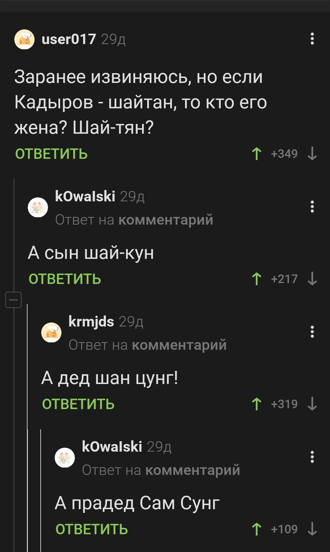 8 papai959 Баяны Родословная 4 года назад #comment_201432584 Комментарии на Пикабу Скриншот Шайтан Рамзан Кадыров Ещё 0