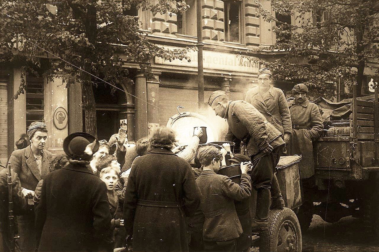Фашизм принес немецкому народу позор, несчастье, моральное падение в глазах всего человечества. Но гуманен и благороден советский солдат. Он протянул руку помощи всем, кто был ослеплён и обманут. И это очень скоро поняли немцы. Стоило войскам остановиться на привал, как у походных солдатских кухонь появлялись голодные немецкие детишки. А потом подходили и взрослые. Чувствовали, что советские солдаты поделятся всем, что они имеют…