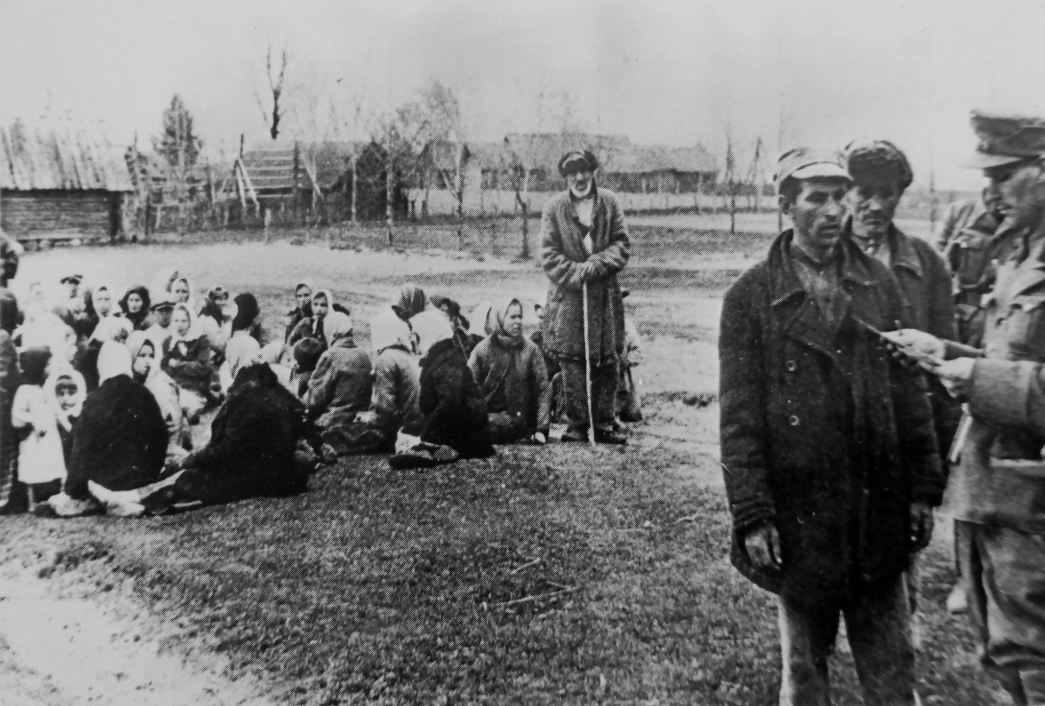 Сотрудники немецкой службы безопасности (Sicherheitsdienst des Reichsführers SS — SD) проверяют жителей оккупированной советской деревни во время антипартизанской операции.
