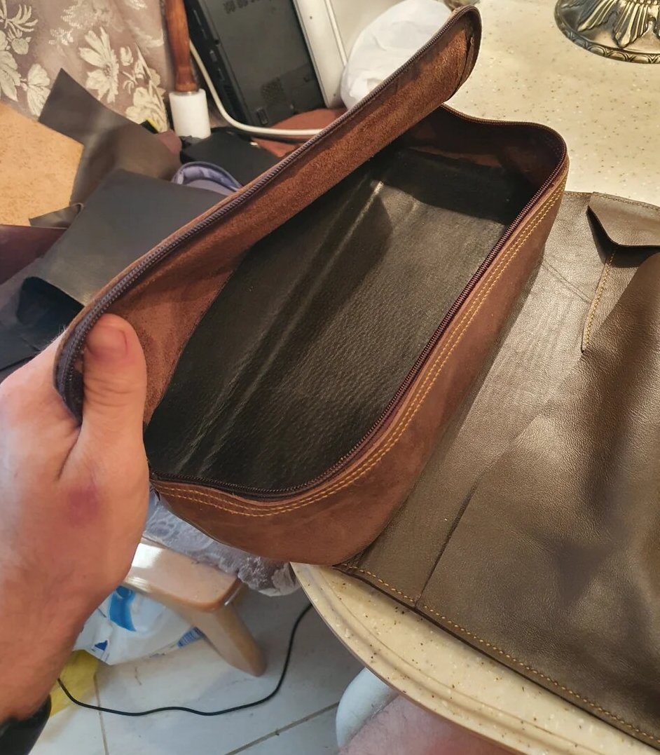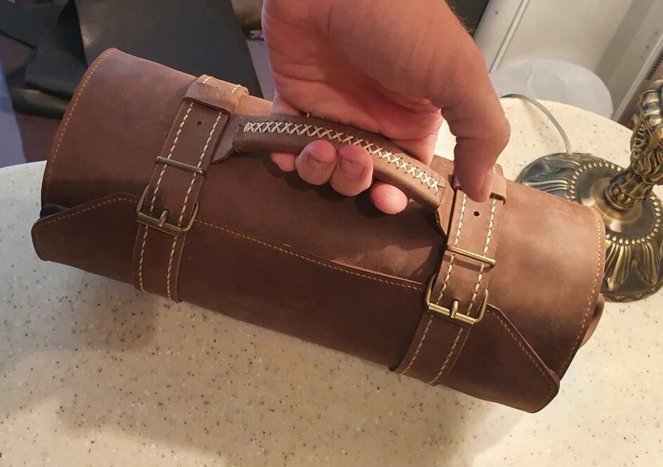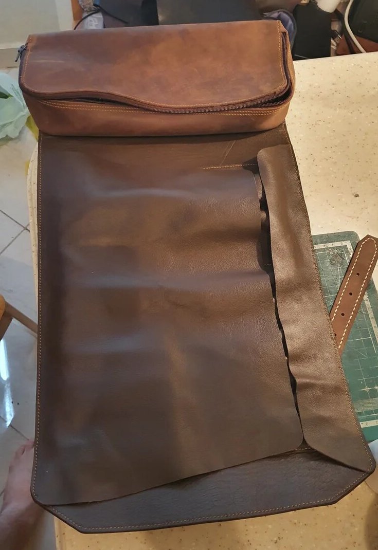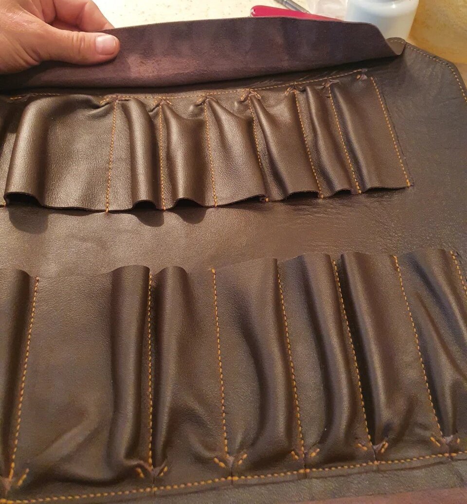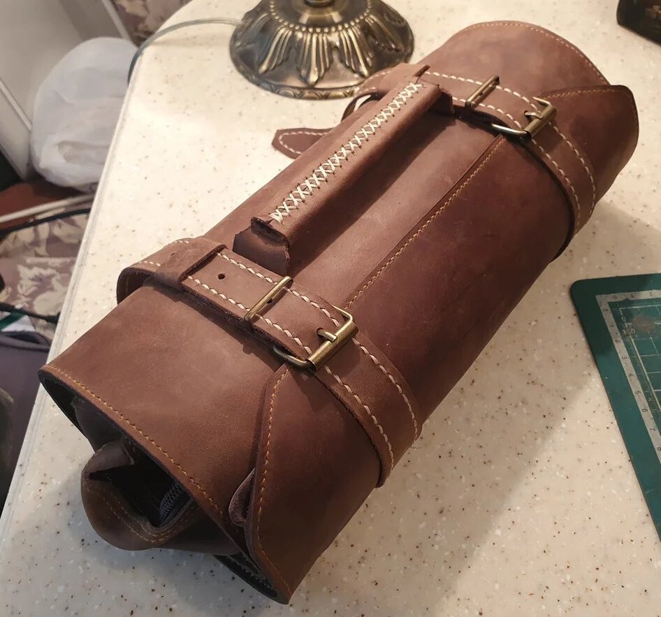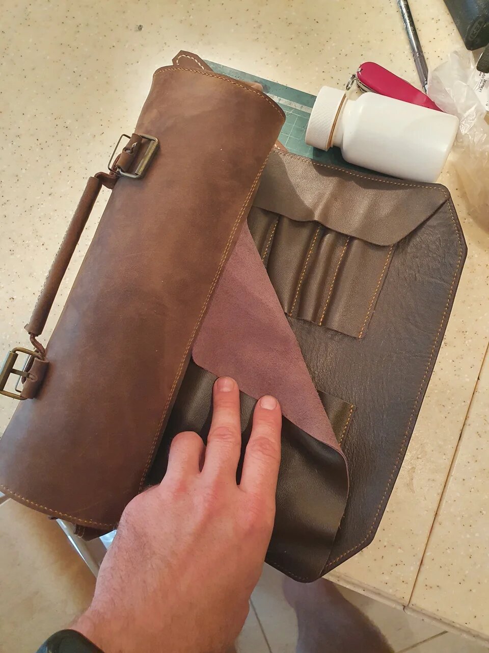 Для меня остро стоит проблема удобной сумки для инструментов. Было решено запилить ролл из крэйзи хорса. Все швы вручную.