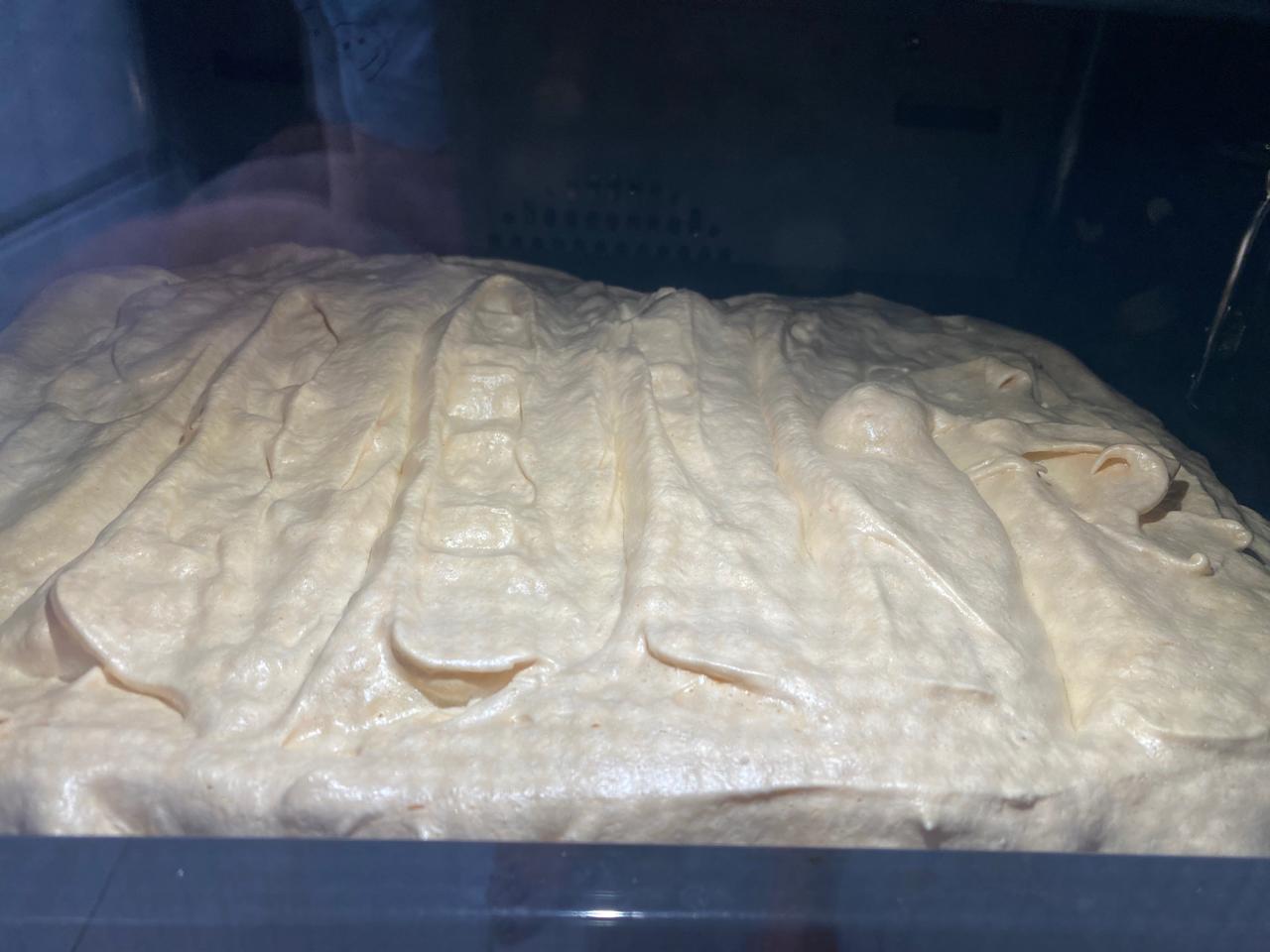 Застелить противень бумагой для выпечки (вариант для эстетов: застелить фольгой, сформировав из неё же бортики, смазав фольгу небольшим количеством масла), вывалить на неё меренгу, разровнять более менее и отправить в разогретую духовку минут на 25-30. До такого себе светло-коричневого цвета.